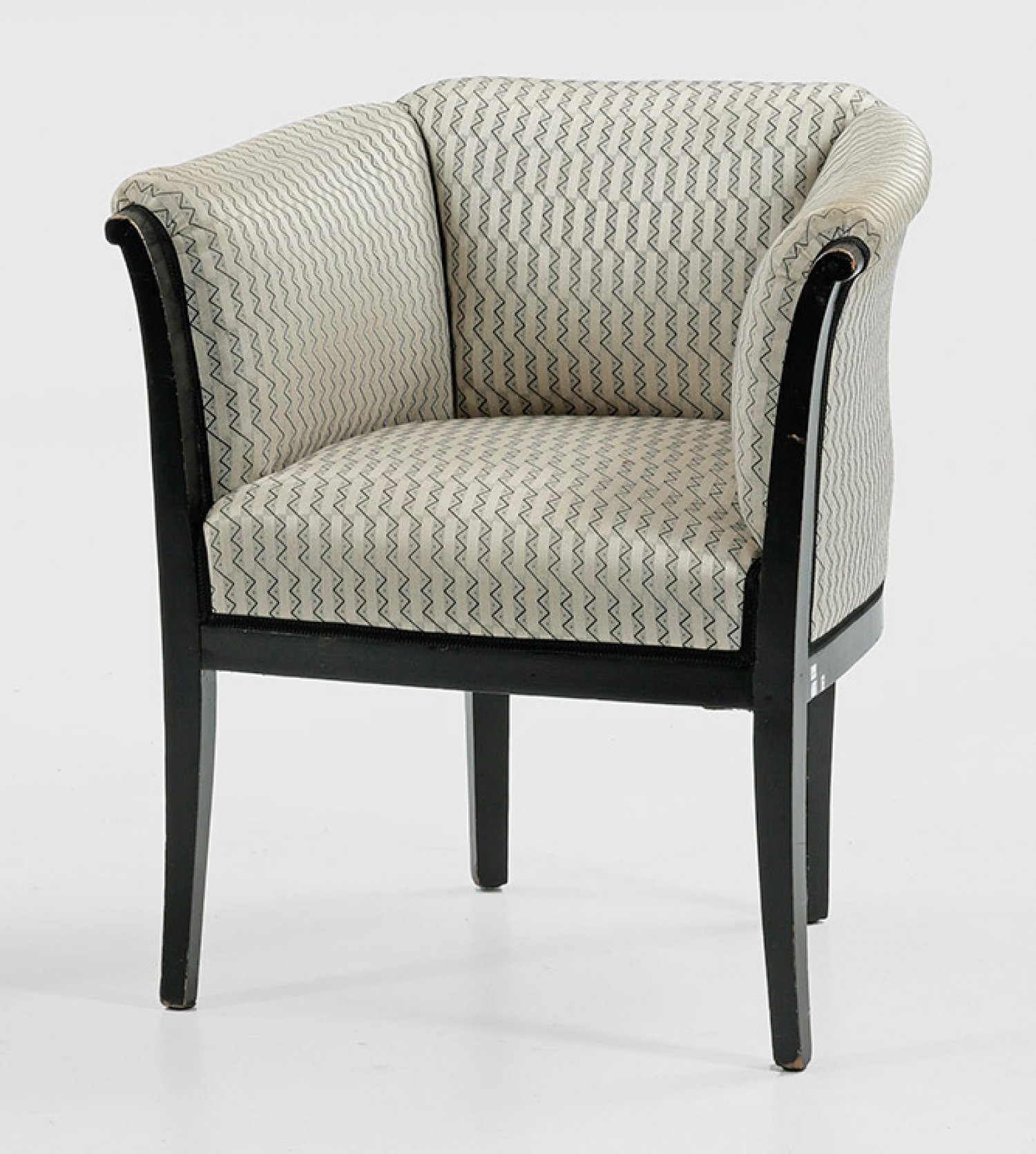 Holz, schwarz lackiert. Hufeisenförmige Zarge auf konischen, leicht ausgestellten Vierkantbeinen, in korrespondierende Streben für schmale Arm- und Rückenlehnenrahmung übergehend. Allseitig gepolstert und mit graugemustertem Backhausen-Stoff im Stil der Wiener Werkstätte bezogen. H. 76 cm. 72 cm x 70 cm. Sitz-H. 47 cm.