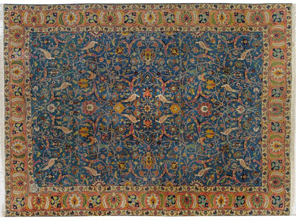 Persien. Um 1920. Wolle auf Baumwolle. Im hellblauen Innenfeld flächendeckend dichte Musterung aus arabesk angelegten Blattranken und Vögeln. Umlaufend breite, apricotfarbene Bordüre aus großen Palmetten. Sign.; Altersspuren. Fransen erg.; 254 cm x 341 cm.