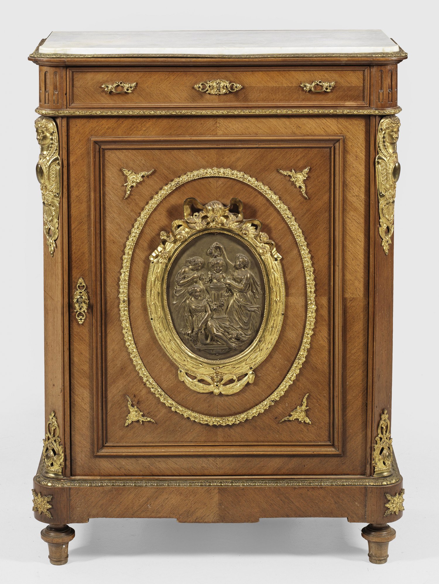 Nussbaum, furniert sowie reiche Applikationen aus Bronze. Gerader, hochrechteckiger Korpus, flankiert von schräggestellten Ecklisenen auf profilierter Zarge und Balusterfüßen. In der gegliederten Front Tür großes Medaillonrelief mit szenischer Darstellung sowie oberhalb schmales Schubfach. Profilgerahmte Deckplatte aus weißem Marmor. H. 112 cm. 81 cm x 36,5 cm.