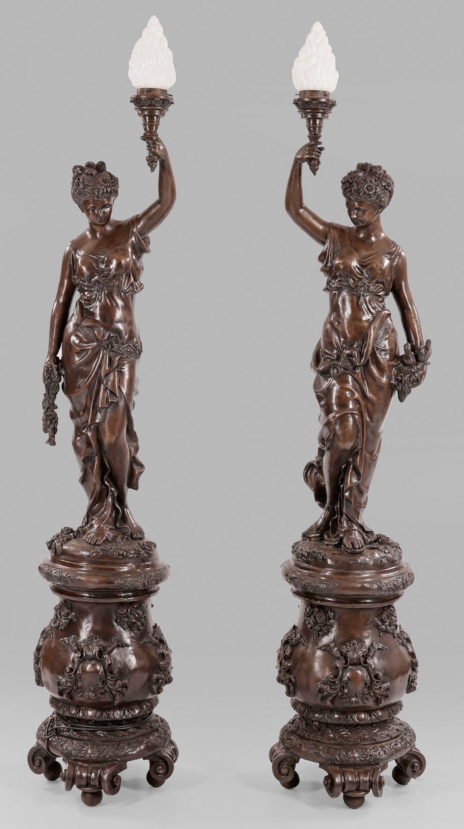Gegenstücke. 1-flg.; Bronze, dunkel patiniert. Vollplastisch gestaltete, weibliche Allegorien mit Attributen für den Frühling, ein Fackelelement mit flammenförmigem Glasschirm emporhaltend. Unterhalb hoher, mehrfach gegliederter Balustersockel mit erhaben reliefierten Blattkartuschen und üppigen Rosenblüten auf kräftigen Voluten. Undeutl. bez. "(..) Wannassi 1998". Elektrifiziert. H. 250 cm.