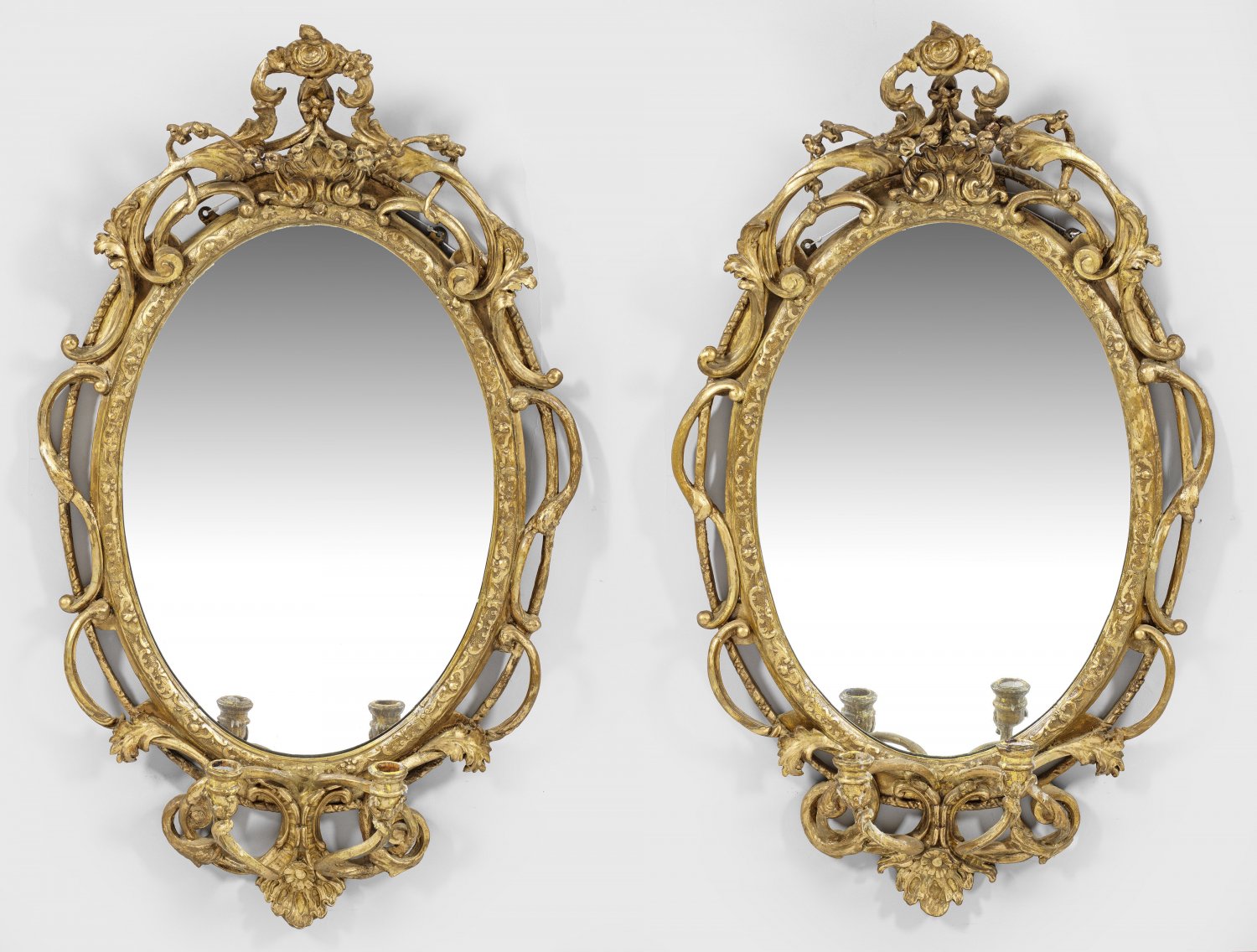 2-flg.; Holz, stuckiert, gefasst und vergoldet. Hochovale, profilierte Spiegelrahmung, umgeben von durchbrochen gearbeiteten Voluten. Korrespondierende, vorkragende Bekrönung mit Akanthusblatt und Blüten sowie stark geschwungene Leuchterarme. 109 cm x 63 cm.