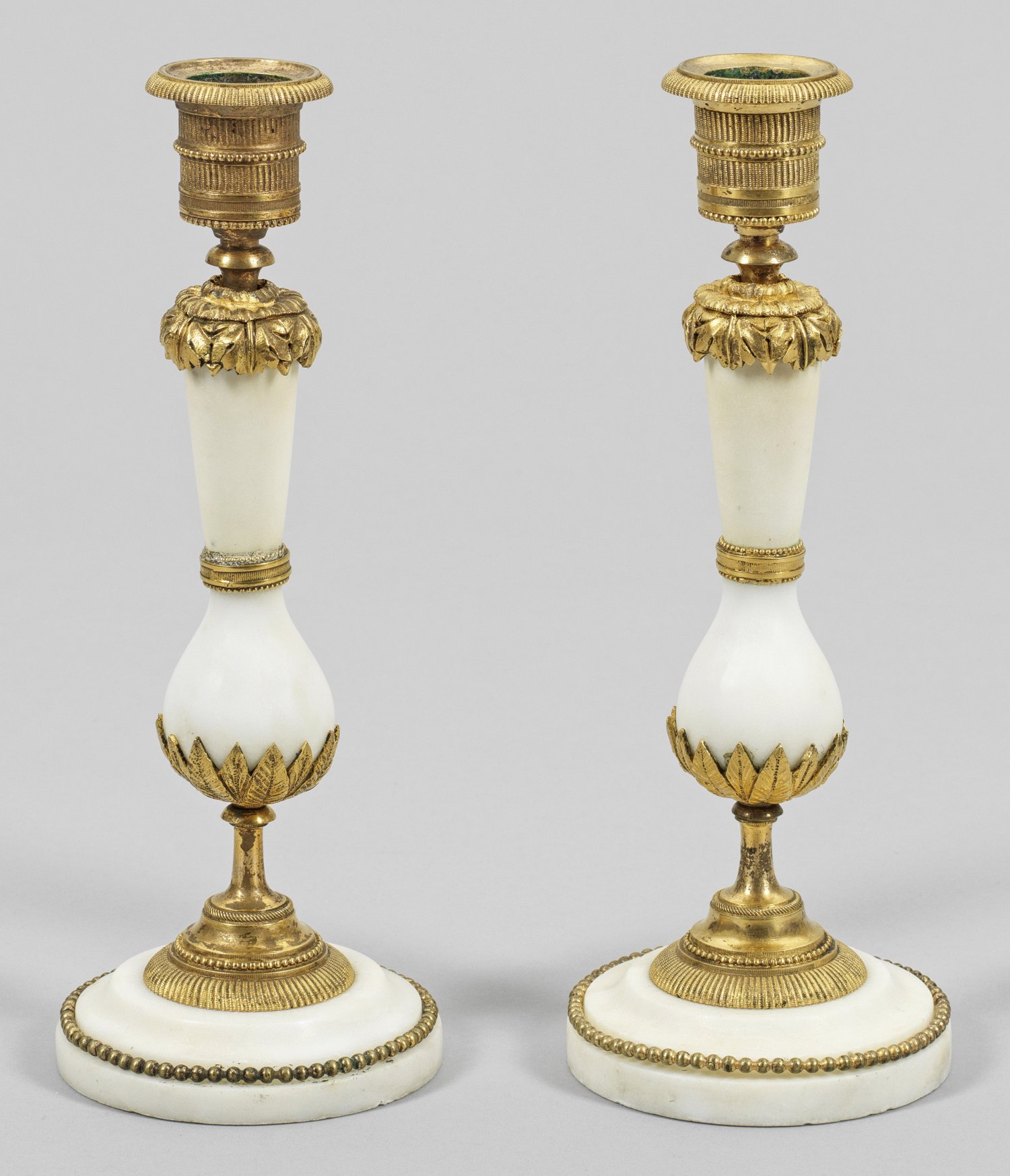 A pair of French white marble and gilt bronze Napolen III candlesticks.