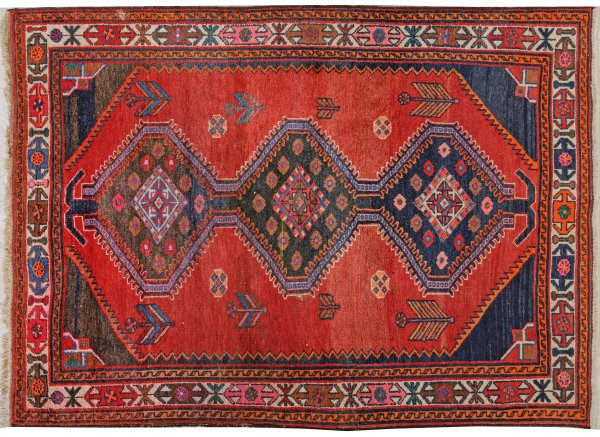 Kaukasus. Russland. Wolle auf Baumwolle. Im hellroten Innenfeld drei große, gereihte Rautenmotive mit Blütenrosetten. Umlaufend mehrteilige Ornamentbordüre. 150 cm x 205 cm.