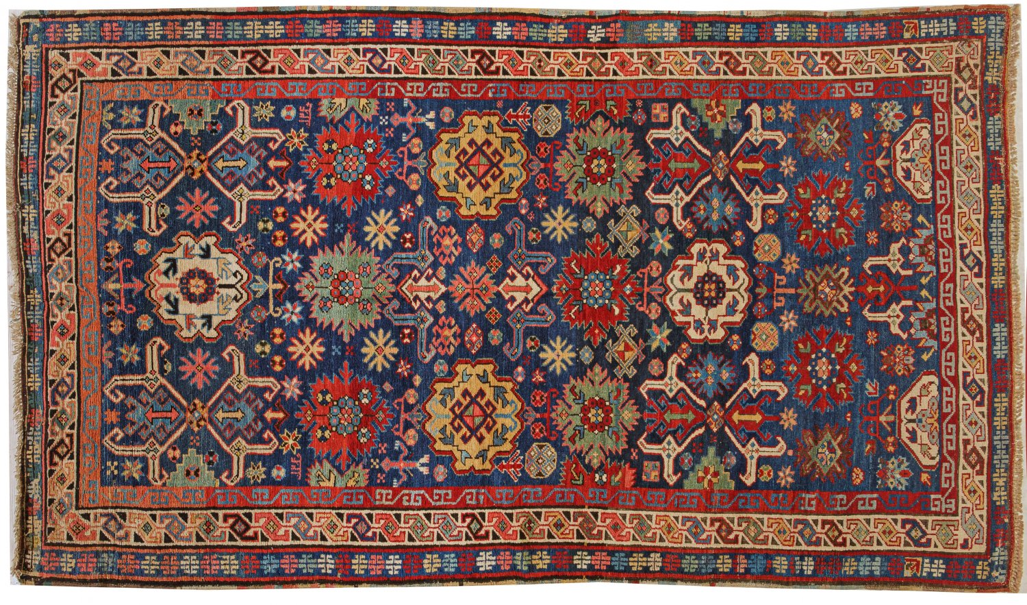 Kaukasus. Um 1900. Wolle auf Wolle. Im blaunen, leicht abraschierten Innenfeld flächendeckende Musterung aus unterschiedlichen roten, grünen und gelben Reserven sowie zwei kleinen Figuren, Rautenmotiven und Sternen. Umlaufend dreigeteilte Bordüre aus unterschiedlichen Borten. 280 cm x 158 cm.