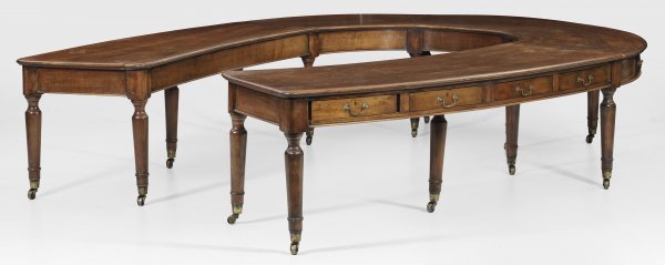 sog. "Horseshoetable". Mahagoni, massiv und furniert. 3-tlg., hufeisenförmig angelegte Zarge, umlaufend mit diversen Schubladen auf mehrfach gegliederten Balusterbeinen mit Rollen. Korrespondierende, gering überstehende, profilierte Deckplatte. Schlösser bez. "LEVER Hobbs & Co, London". H. 74 cm. 287 cm x 395 cm.