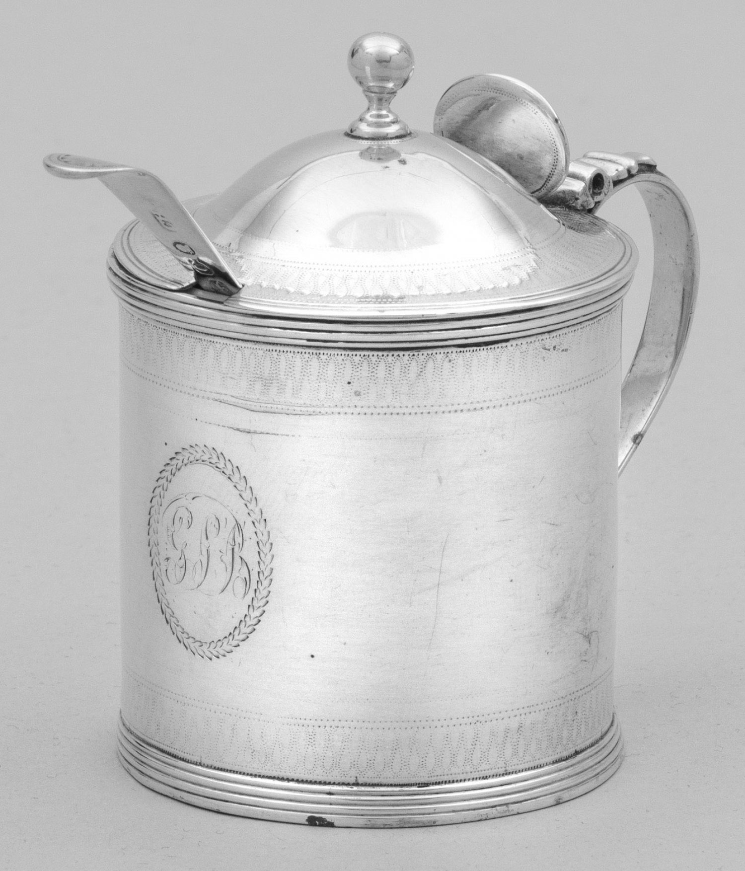 Silber, Porzellan. Zylindricher Korpus mit geschwungenem Ohrenhenkel und scharniertem Deckel mit Kugelknauf. Wandung mit ziseliertem Dekor und Monogramm. Innen Porzellaneinsatz sowie ergänzter Löffel. Scharnier besch.; Gest., Beschaumarken, Meister John Emes (tätig seit 1798) und Charles Hougham (tätig seit 1769). Gew. ca. 95 g. H. 8,5 cm.