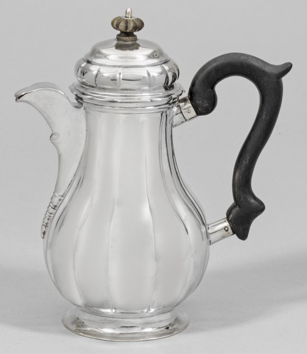 Silber. Über rundem, eingezogenem Stand birnförmiger Korpus. Wandung und haubenförmiger Scharnierdeckel gegliedert durch passig geschweifte, vertikal godronierte Rippen. Tief angesetzter, profilierter Konsolausguss. Schwarz lackierter Ohrenhenkel aus Holz und Balusterknauf aus blütenförmig geschnitztem Ebenholz. Gest., undeutliche Stadtmarke und Wardeinzeichen, Jahresbuchstabe "H", Meister Johannes Conrad Trappen (wird Meister 1749). Gew. ca. 450 g. H. 20,5 cm.