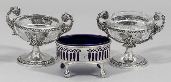 Silber und farbloses sowie kobaltblaues Glas. Über vier stilisierten Klauenfüßen durchbrochen gearbeiteter, ovaler Korpus mit blauem Glaseinsatz bzw. trompetenförmigem Stand, übergehend in durchbrochen gearbeitete Wandung, bestehend aus reliefplastischen Weinreben und Palmetten. Zwei geschwungene Henkel mit Blütenrosetten und Glaseinsatz. Teilw. besch.; Eine gest., Stadtmarken, Jahresbuchstabe "U", Meister Robert Hennell I. (tätig ab 1772). Gew. zus. ca. 160 g (ohne Glaseinsatz). H. 5 cm - 9,5 cm.