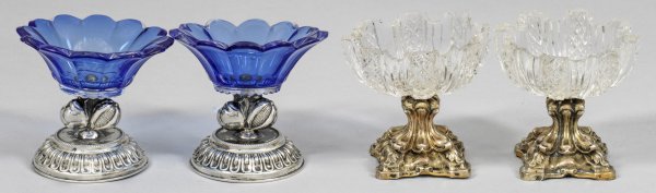 Two pairs of German Biedermeier silver and glass salieres. Age-related signs of use, glass dented. Partly standard mark 13 lot.