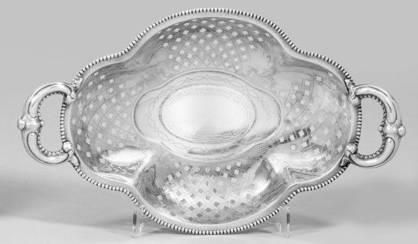 Silber. Über vier reliefierten Füßen passig geschweifter, durchbrochen gearbeiteter Korb mit seitlich volutierten Henkeln. Die vertiefte Fahne mit Mäanderband und Rocaillen, der Rand umlaufend mit Perlband verziert. Gest. 13 Lot. Gew. ca. 300 g. H. 8,5 cm. 37 cm x 22 cm.
