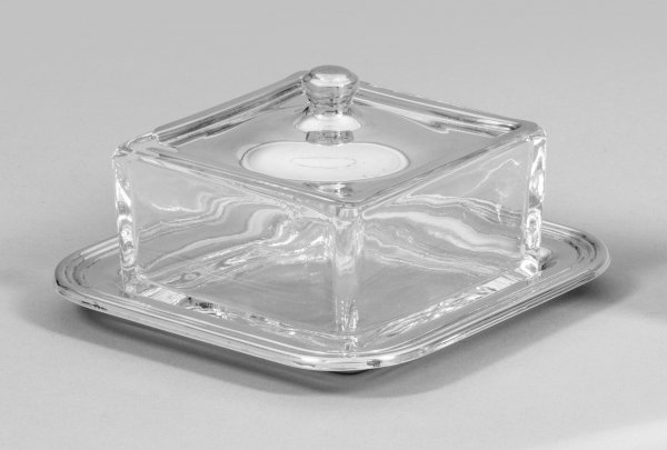 Silber und Glas. Quadratischer, gemuldeter Untersetzer mit mehrfach profiliertem Rand und gerundeten Ecken. Darüber eine flache, quadratische Schale mit gering gewölbtem Deckel und gedrücktem Balusterknauf. Im Deckel Aussparung für ergänzten Löffel mit muschelförmiger Laffe. Gest. 800 bzw. 925. Beschauzeichen, Stadtmarke. H. 6,5 cm. 12 cm x 12 cm.