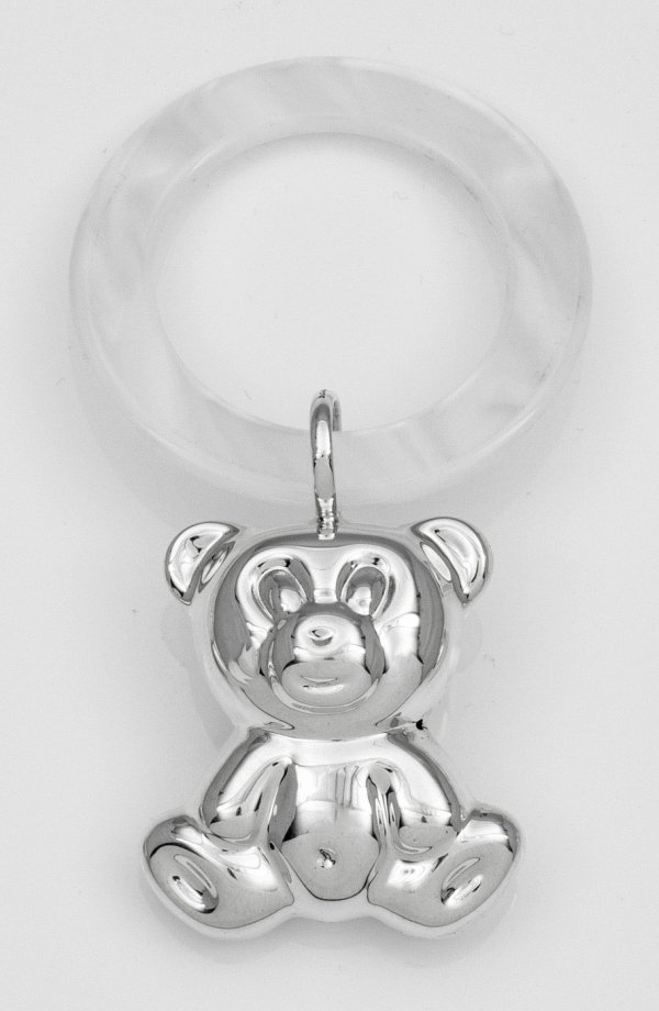 Silber. Vollplastische Rassel in Gestalt eines Bären mit Beißring aus Kunststoff. Gest. 925. Gew. ca. 25 g.