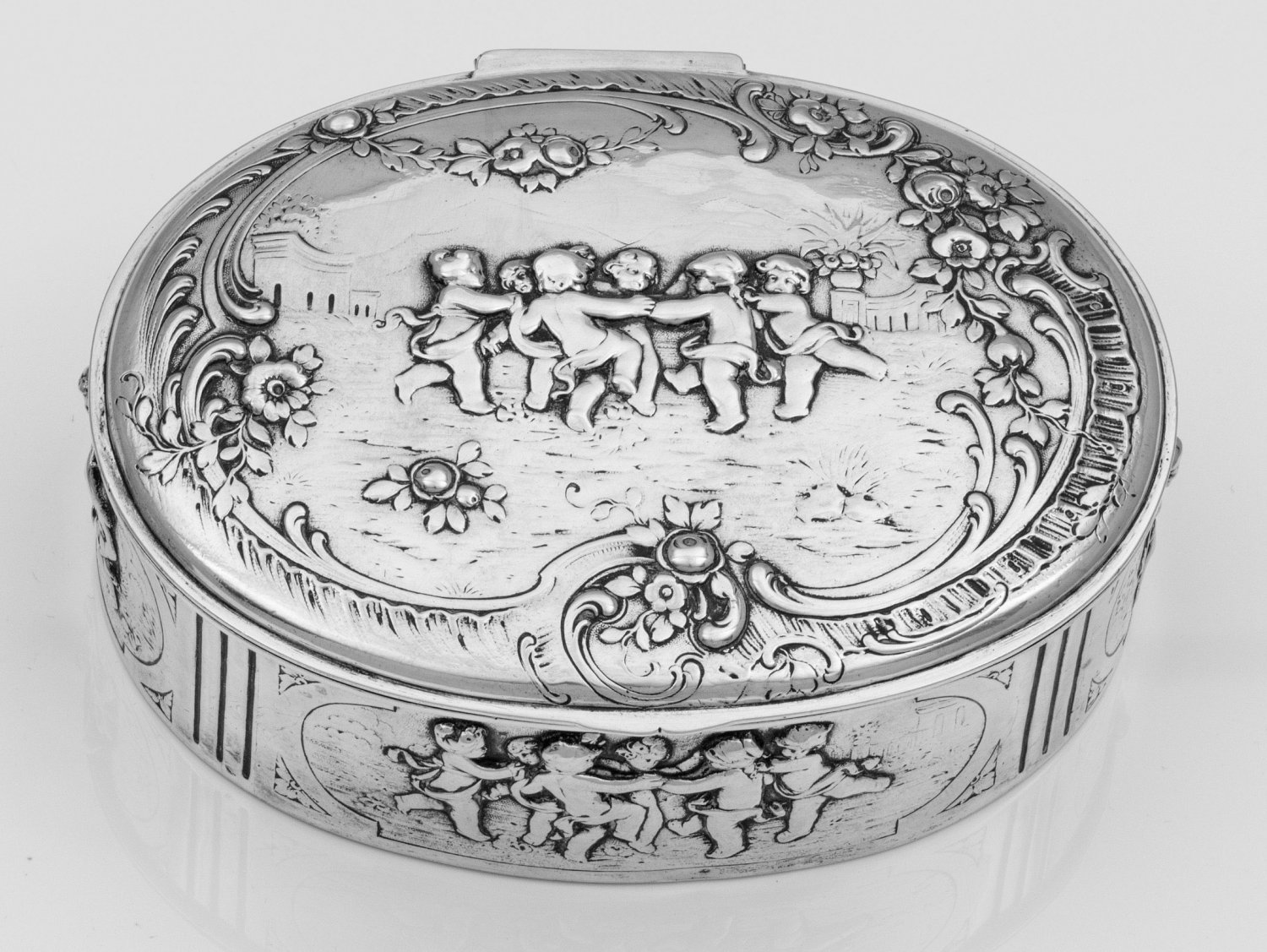 Silber. Ovale Form mit gerader Wandung und scharniertem, gering gewölbtem Deckel. Auf der Wandung sowie dem Deckel reliefplastisch gestaltete Kartuschen mit szenisch dargestellten Puttoreigen, gerahmt von Rocaillen und Rosenblüten. Minim. Gebrauchsspuren. Gest. 800, Herstellerzeichen. Gew. ca. 535 g. H. 6 cm. 17,5 cm x 13,5 cm.
