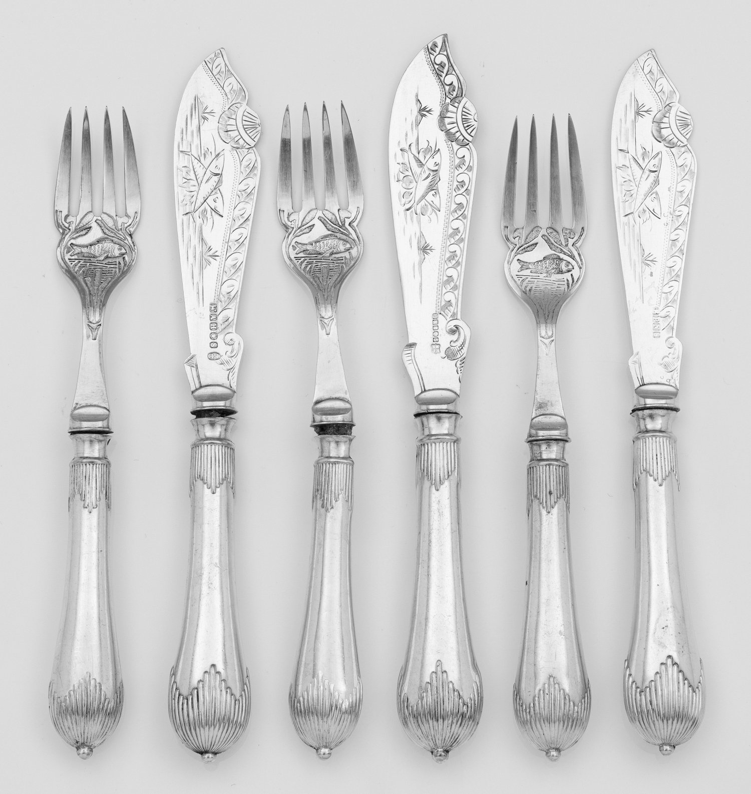 18-tlg.; Plated. 9 Fischmesser sowie 9 -gabeln. Konischer Griff, verziert mit zungenförmigen Godronen. Auf der Klinge bzw. Forke schauseitig fein ziselierte Darstellungen von Fischen, umgeben von floralem Dekor. Teilw. besch.; Gem.; L. 19 cm - 21,5 cm.