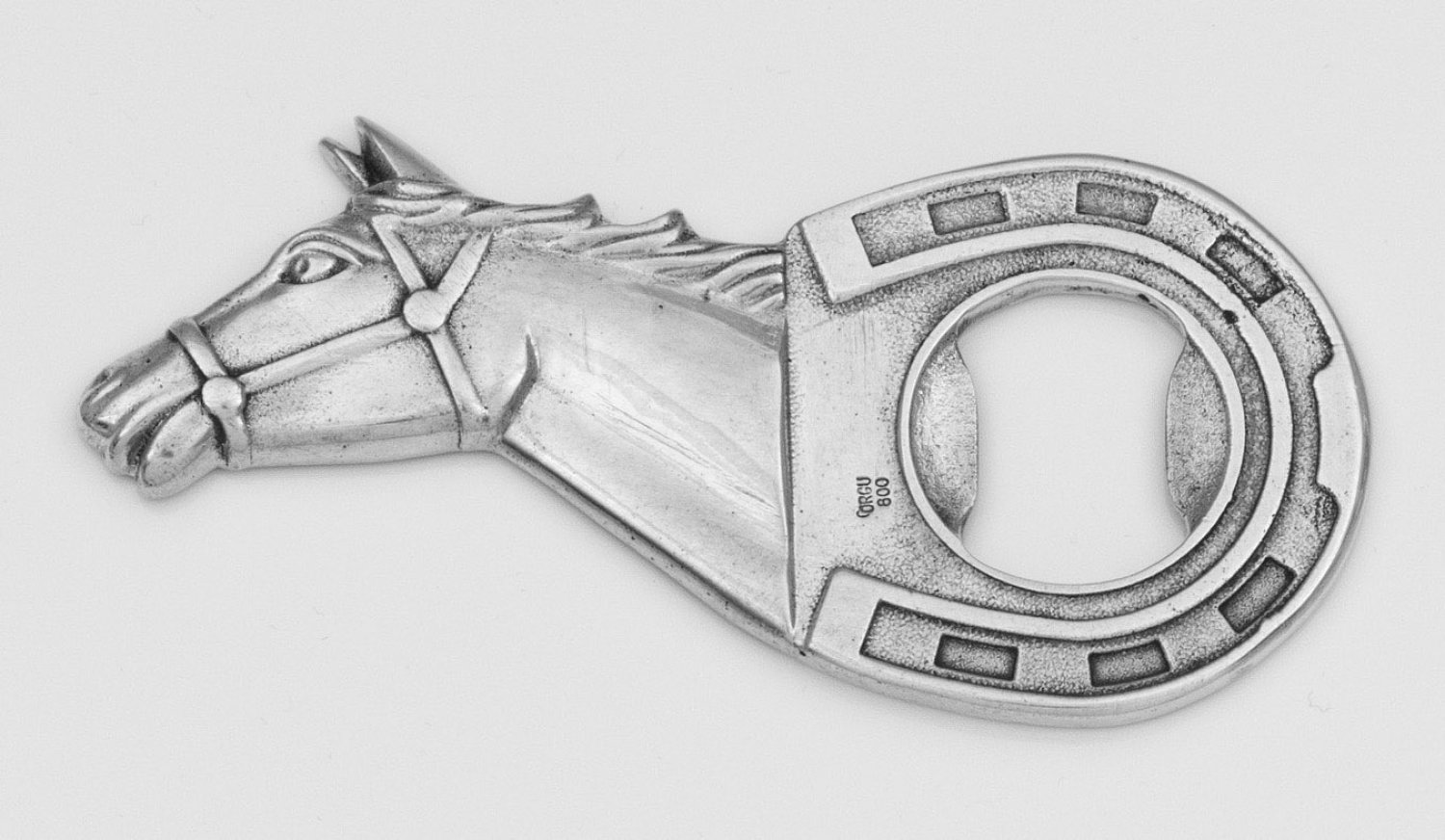 A Turkish silver bottle opener in shape of a horse head. Standard mark 800. Manufacturer's mark.