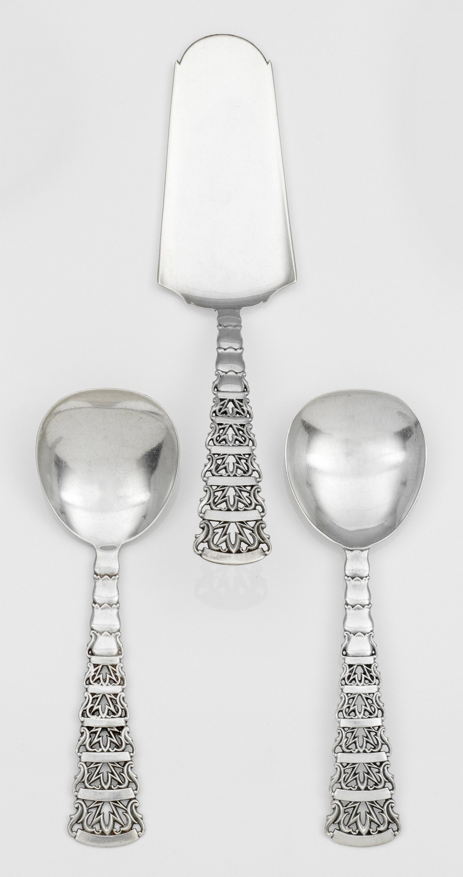 Silber. Zwei Vorlegelöffel und ein Kuchenheber. Gering gemuldete Laffe, übergehend in sich konisch erweiternden Griff in Form von stilisierten Blütenknospen und abstrakt durchbrochen gearbeitetem und volutiertem Dekor. Atelierentwurf vor 1926, Modell-Nr. 21900. Gest. 800, Herstellerzeichen. Gew. zus. ca. 265 g. L. 19 cm x 24,5 cm.