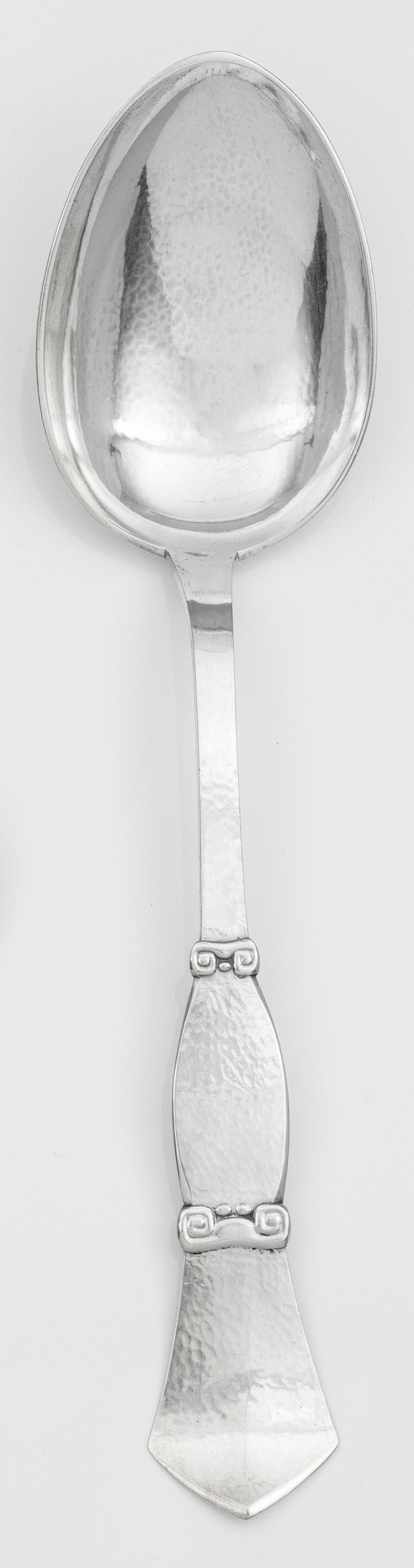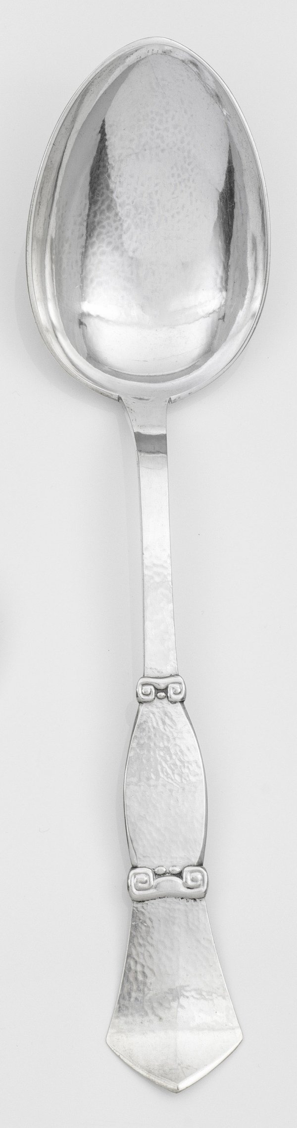 Silber. Große ovoide Laffe, übergehend in sich konisch erweiternden, spitz zulaufenden Griff, verziert mit stilisierten, kantigen Voluten. Flächendeckender Hammerschlagdekor. Gest., Stadtmarke, Beschaumeister C. F. Heise, Herstellerzeichen. Gew. ca. 220 g. L. 37 cm.