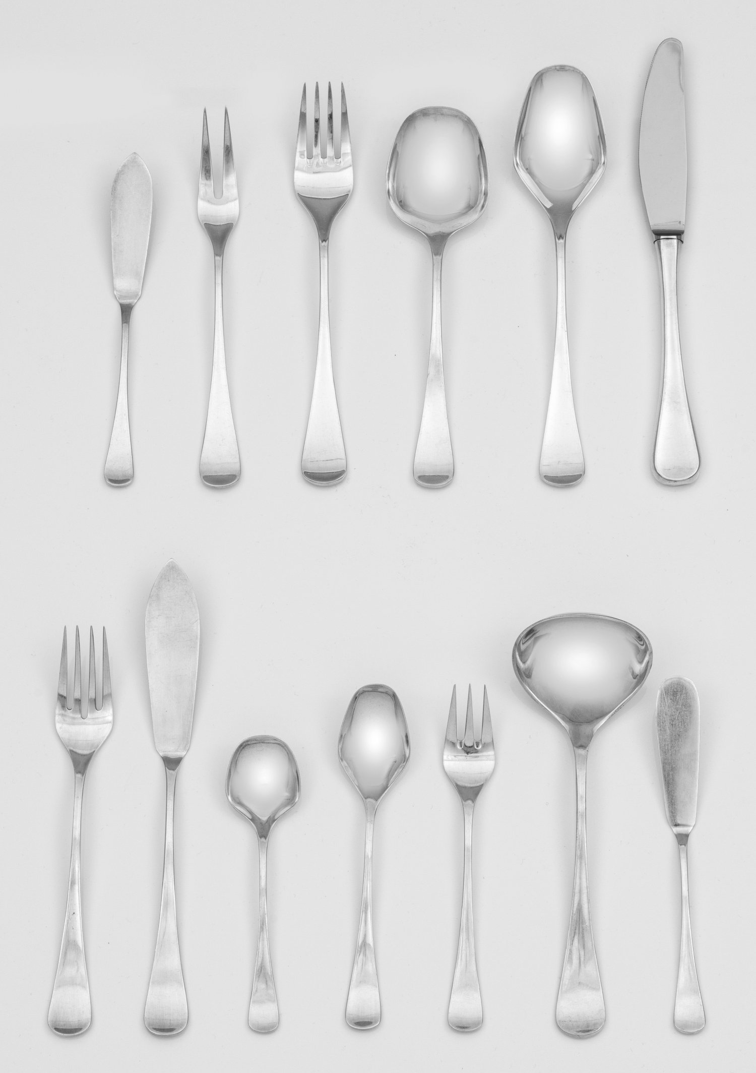 74-tlg.; Silber. Mit Holzbox. 12 Speisemesser, 12 -gabeln, 12 -löffel, 12 Kuchengabeln, 12 Teelöffel, 4 Fischmesser und 4 -gabeln, 6 Vorlegeteile. Sich konisch erweiterndes, glattes, gering gemuldetes Heft. Ein Teelöffel mit abweichender Größe. Gest. 925, Herstellerzeichen. Gew. zus. ca. 3350 g (Gew. ohne gefüllte Teile ca. 2450 g). Dazu ein Konvolut Wappenlöffel sowie Bestecke aus Silber mit anderem Dekor und unterschiedlichen Herstellerzeichen.