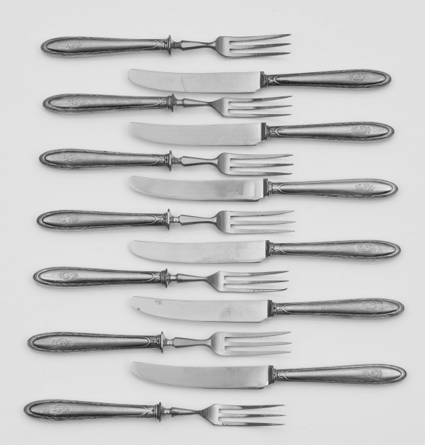 13-tlg.; Silber. 6 Obstmesser und 7 -gabeln. Konischer, oblonger Griff mit wellenförmig profiliertem Rand. Monogr. "E G". Gest. 800, Herstellerzeichen. Gew. zus. ca. 335 g.