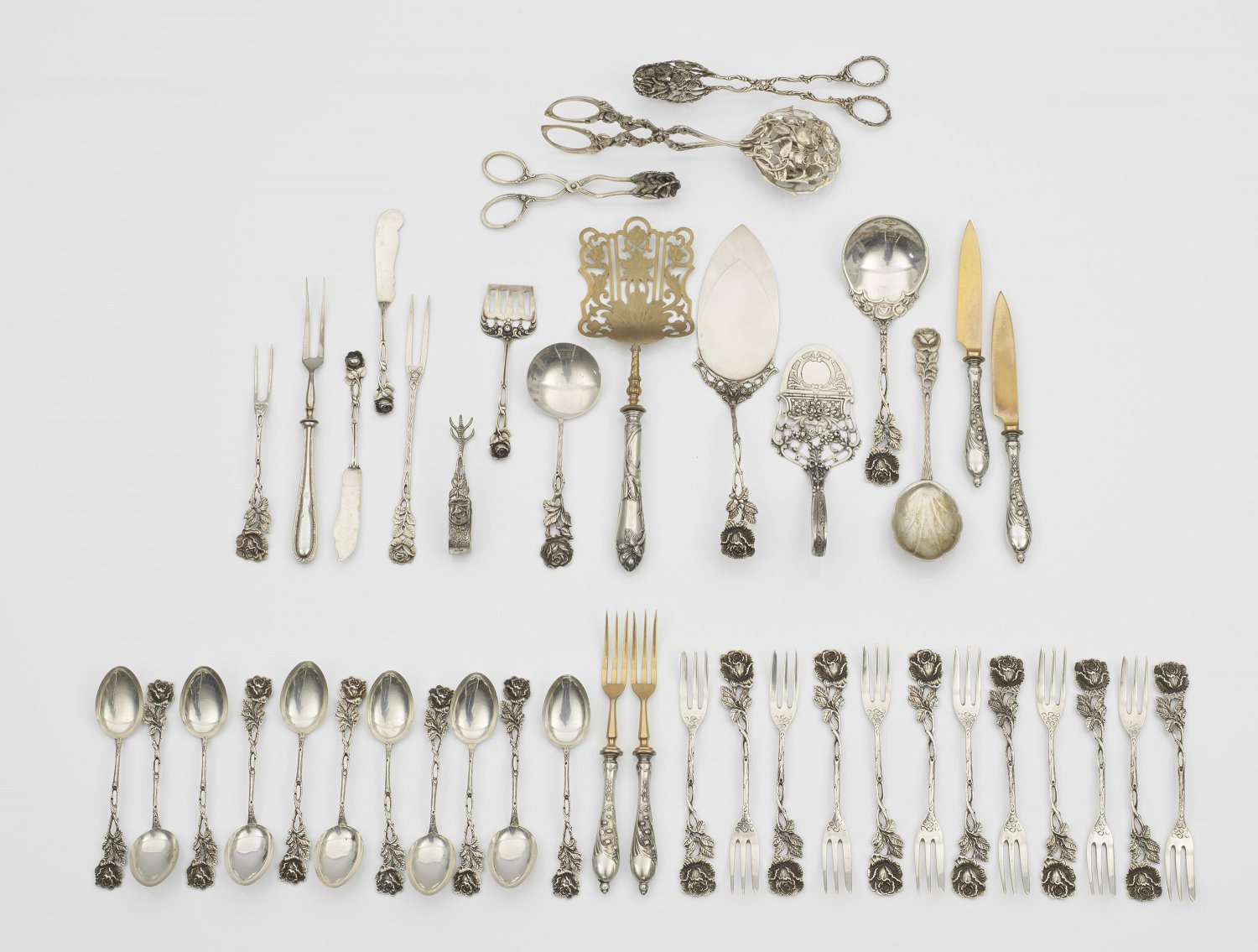 A German 43-piece silver mixed cutlery with roses. Standard mark 800.