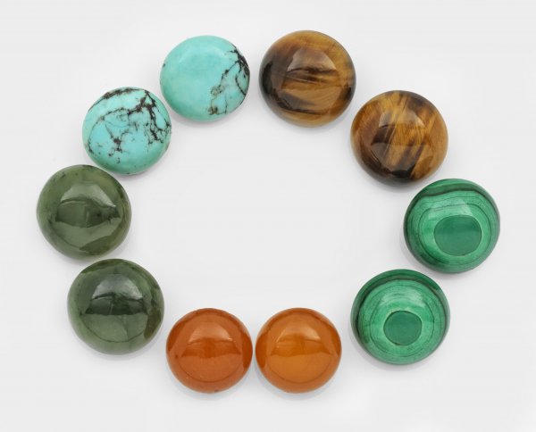 Silber, gest. 835. Besetzt mit Malachit, Karneol, Tigerauge, Jade und Türkis im Cabochonschliff.