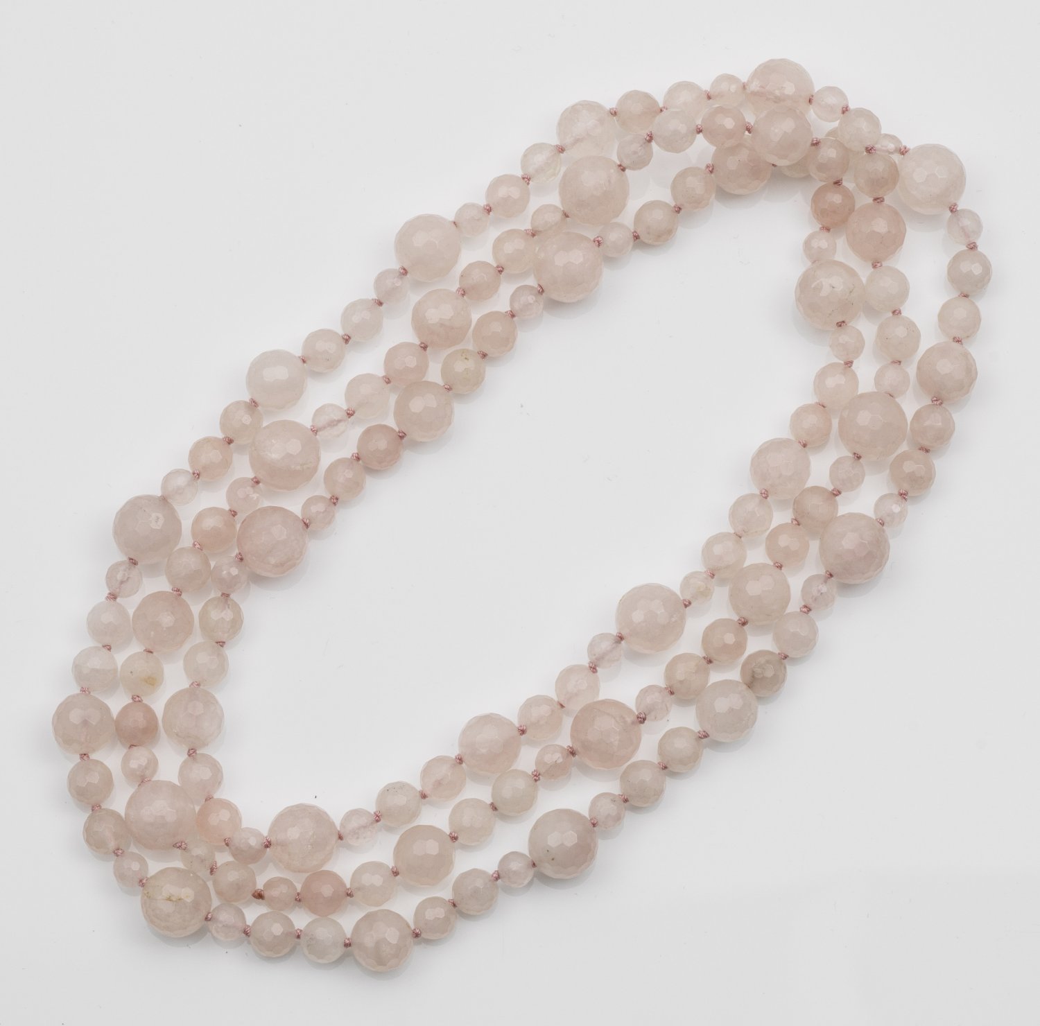 Überlange, einreihige Kette aus zartrosafarbenen facettierten Rosenquarzkugeln von 8 mm - 16 mm. Gew. ca. 281,89 g.