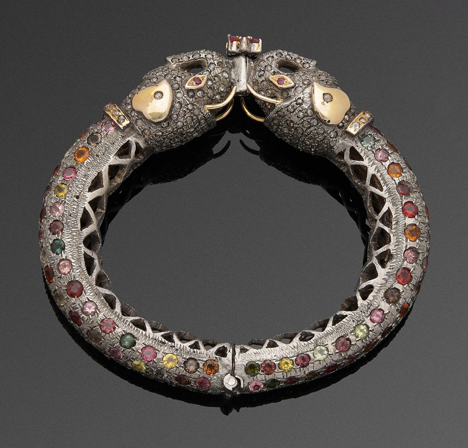 Silber. Zweigeteilter Reif, in plastischen Elefantenköpfen endend. Schauseitig besetzt mit Turmalinen in den Farben Lemon, Pink, Orange und Grün, kleinen Rubinen sowie Diamantrosen. Gew. ca. 88,03 g.