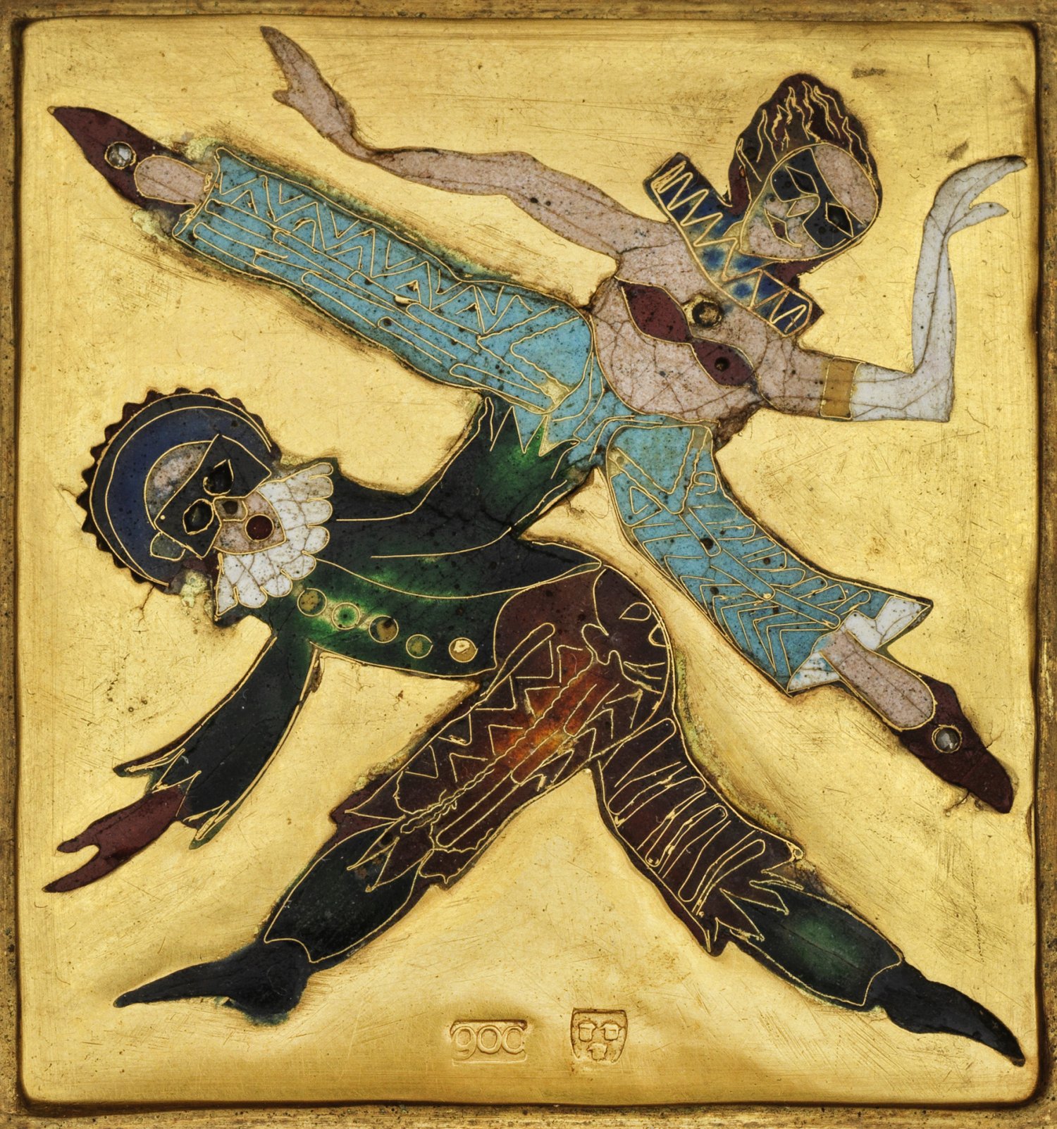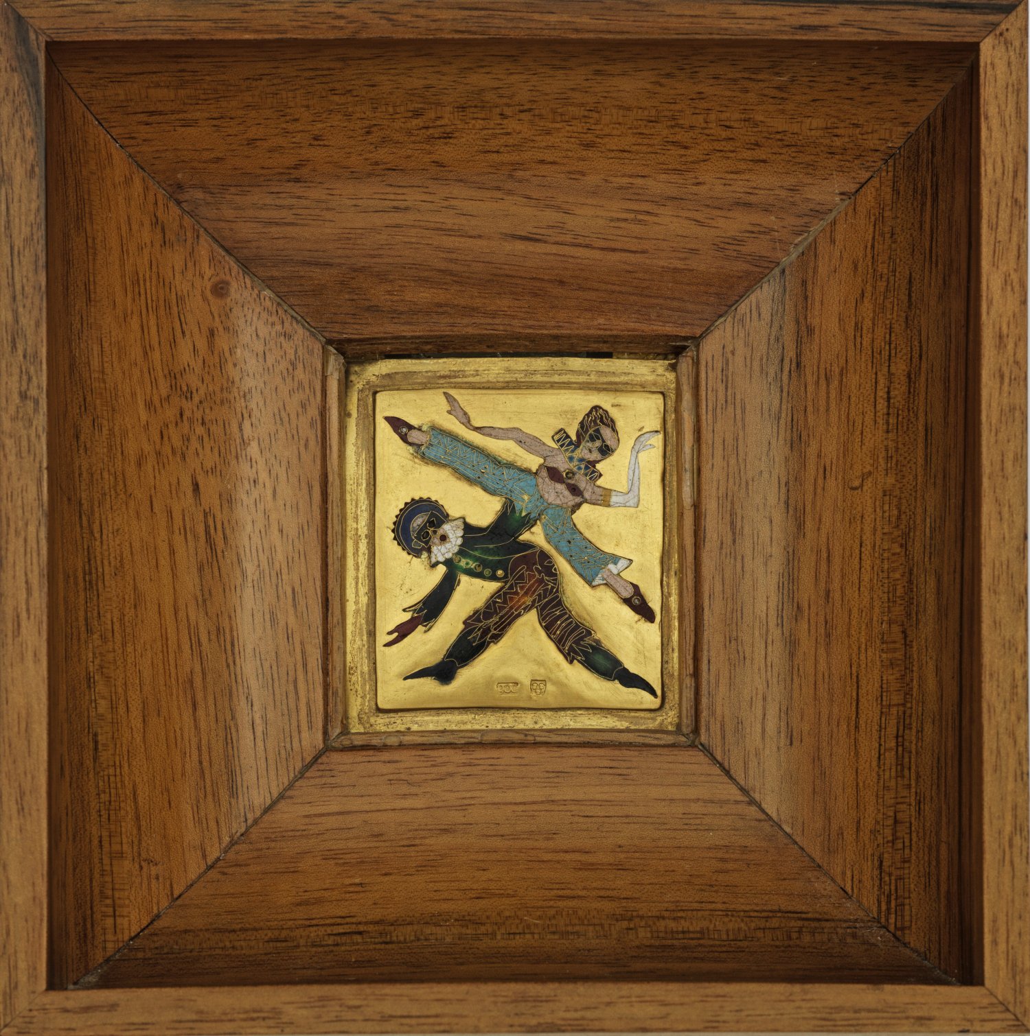 Gold, gest. 900. Quadratisches Bildfeld mit tanzendem, venezianischem Karnevalspaar in feinen polchromen Emaillen bzw. Zellenemail. Meistermarke. Rückseitig Werkstatt-Etikett. 6,5 cm x 6,5 cm. Holz-Rahmen.