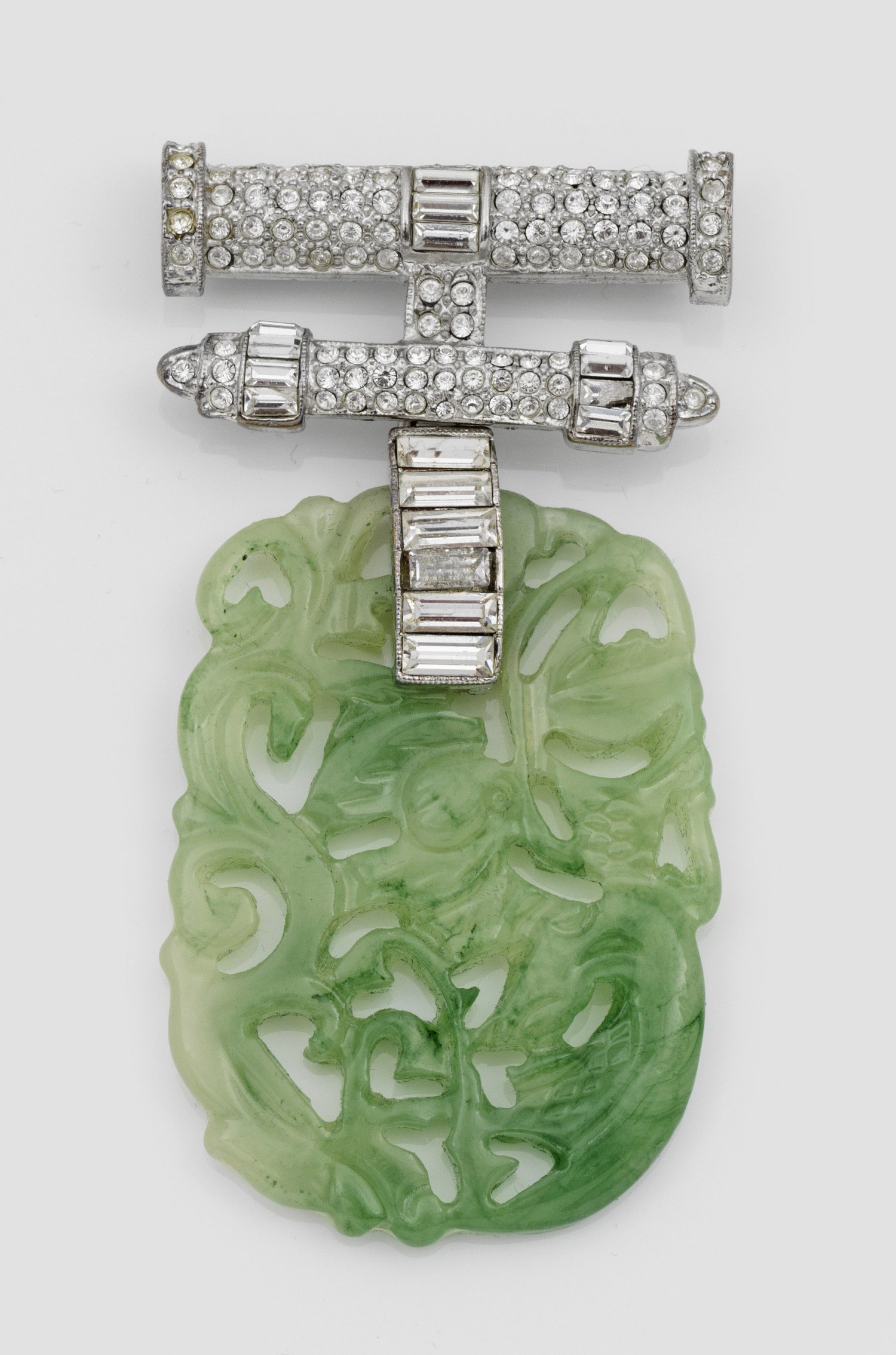 Brooch with paste gem and jade pendant by Kenneth Jay Lane. Manufacturer's mark.
