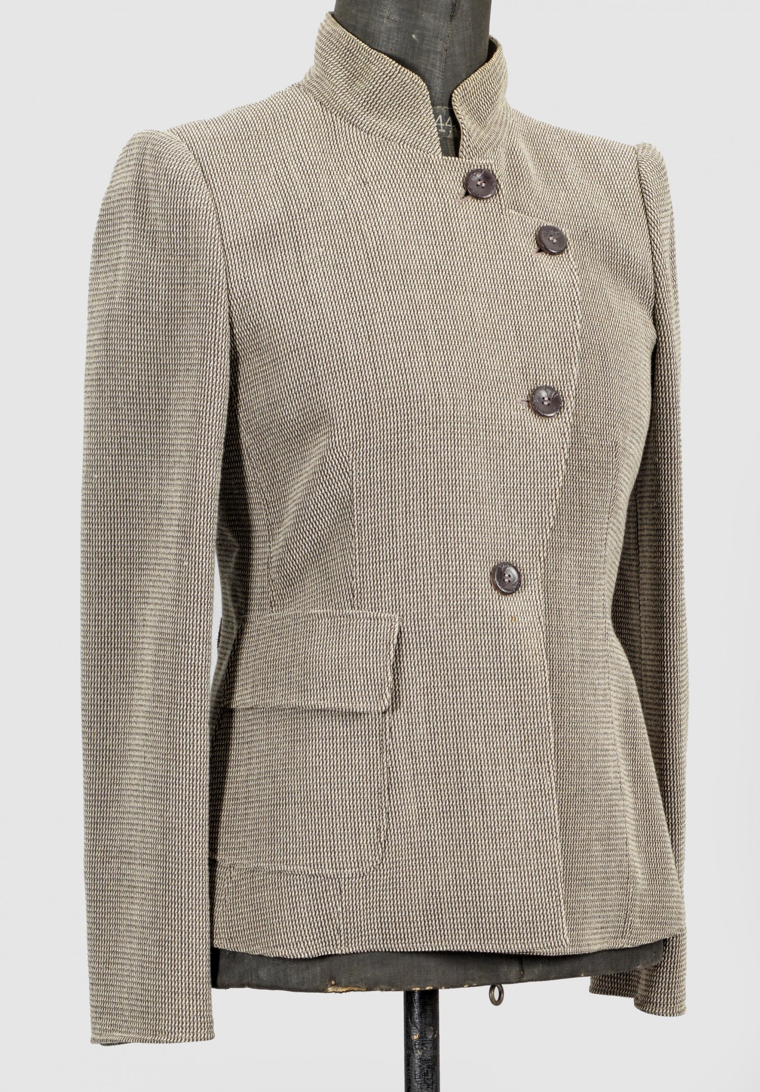 Linie Collezioni. Hellgraue Schurwolle. Kurzgeschnittene, taillierte Jacke mit Stehkragen, schräg angelegter Knopfleiste sowie schauseitig einer Tasche. Herstellerzeichen. Gr. 44. Tragespuren. L. 65 cm.