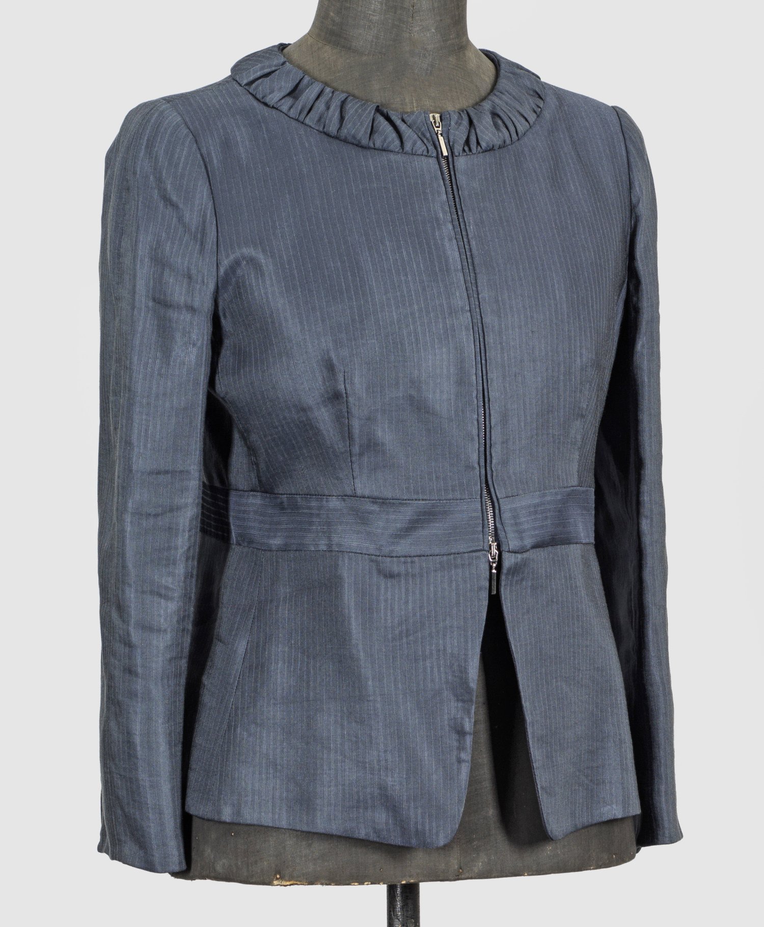 Linie Collezioni. Blaugestreifte Leinenmischung. Kurzgeschnittene, taillierte Jacke mit Rundkragen und kurzem Reißverschluss. Herstellerzeichen. Gr. 46. Tragespuren. L. 56 cm.