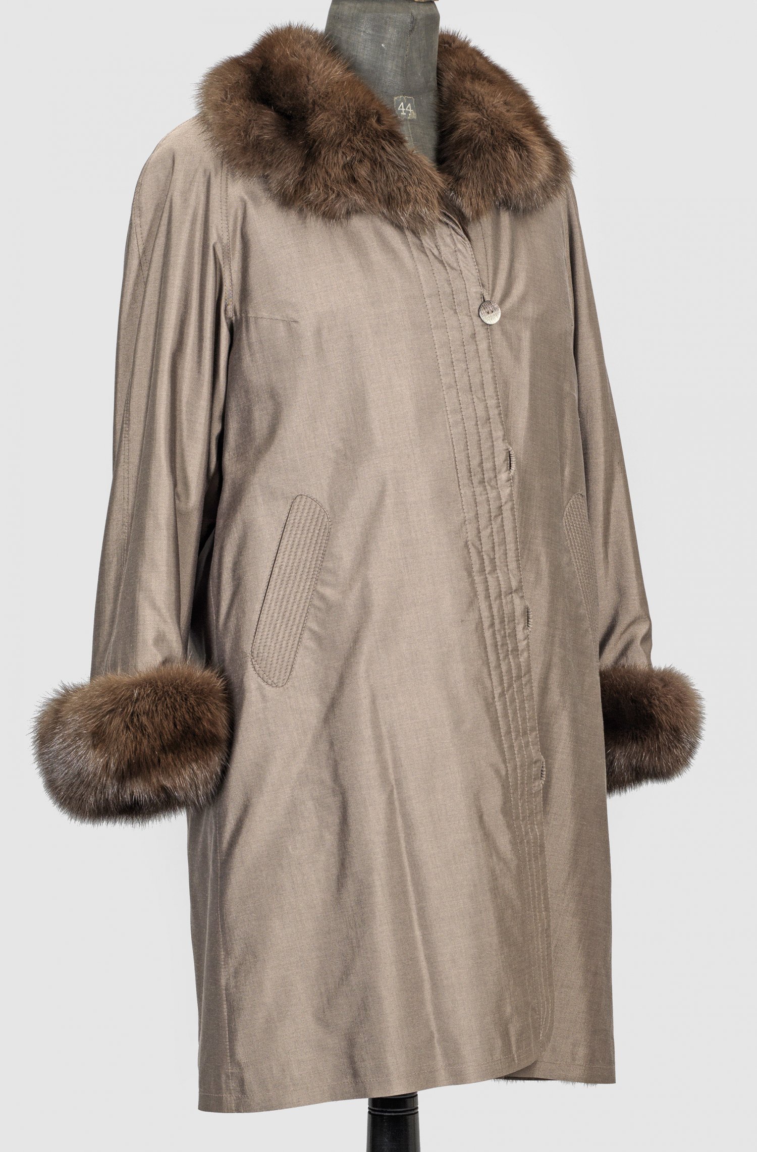 Halblanger, leicht ausgestellt geschnittener Mantel aus grauem Popelin mit herausknöpfbarem Futter wohl aus schokoladenbraunem russisch Feh sowie Kragen und Armumschläge aus Fuchsfell. Innenfutter aus Seide. Label von Karl Neumann, Atelier für Edelpelze, Berlin/Kaufbeuren. Kaum getragen. Gr. 36/38. L. 108 cm.