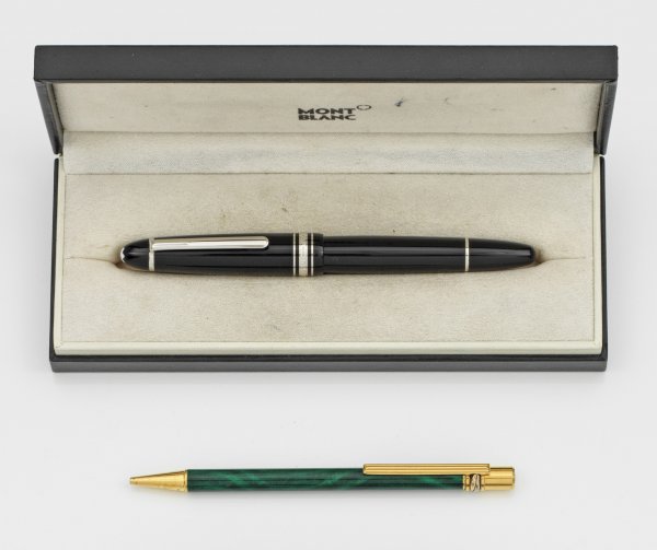 Teilw. in Originalbox. Modell Meisterstück Pix. Tiefschwarzes Edelharz mit platinierten Metallelementen. Handgefertigte 14 k Goldfeder, bez. 4810. Herstellerzeichen. L. 14,5 cm; Metall, vergoldet sowie Lackfond in Malachitoptik und eingelassener Trinity-Ring. Herstellerzeichen. L. 13,5 cm.