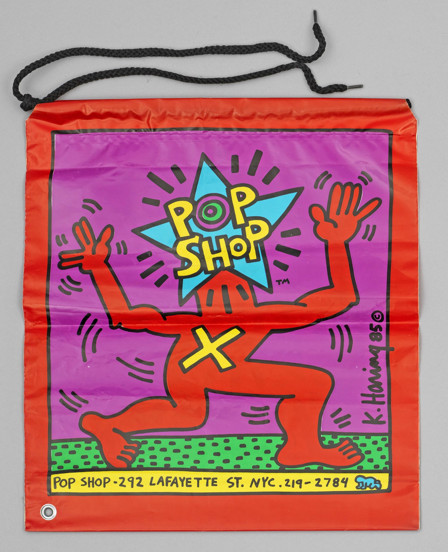 Beidseitig unterschiedlich bedruckte Plastiktüte mit unterschiedlichen Figuren auf rotem Grund, 1985 von Haring für das gleichnamige Geschäft in New York entworfen. 47 cm x 42 cm.