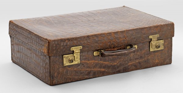 Cognacfarbenes, in Krokooptik geprägtes Leder. Rechteckiger Korpus mit entsprechendem Flachdeckel und gerundeter Handhabe. Braungemusterte Stoffauskleidung mit Herstellerzeichen. Schlösser bez. "LEVER LOCK Finnigans Manchester". Seitlich Monogramm. E.B.; H. 21 cm. 65 cm x 42 cm.
