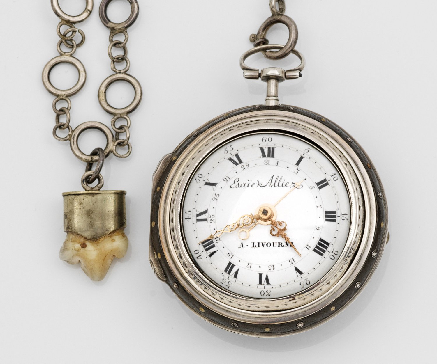 Silber. Dreifachgehäuse mit Leder bezogen, weißes Emailzifferblatt mit schwarzer Ziernageldekoration und Louis XV-Goldzeiger. Fein zieseliertes feuervergoldetes Spindelwerk mit Kette/Schnecke als Schlüsselaufzug. Werk-Nr. 5854. Gew. ca. 135,53 g.