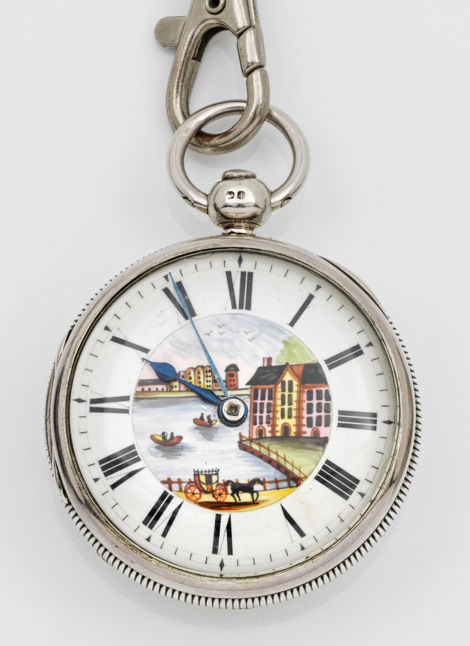 London-Cripplegate, um 1800. Silber. Dreifachgehäuse, weißes Emailzifferblatt mit schwarzen römischen Zahlen und Breguetzeiger, mittig Flusslandschaft mit Architektur in polychromer Emaillemalerei. Fein zieseliertes feuervergoldetes Spindelwerk mit Kette/Schnecke als Schlüsselaufzug. Herstellerzeichen. Dazu Uhrenkette mit Karabinerschließe. Gew. ca. 130,46 g.