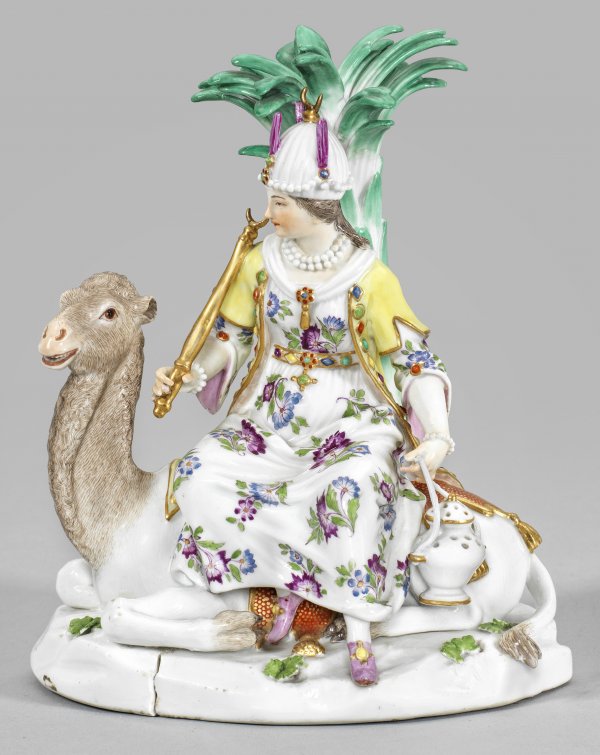 aus der Serie "Vier Erdteile". Naturalistisch gestalteter, mit plastischen Blättern belegter Sockel. Vor einer Palme, auf einem Dromedar sitzende, zur Seite blickende Asiatin mit orientalischer, federgeschmückter Haube. Gehüllt in einen gelben Mantel über langem, blütengemustertem Gewand. In der linken Hand ein Rauchgefäß, in der Rechten ein goldenes Zepter haltend. Das naturalistisch staffierte Dromedar bedeckt mit einer eisenroten, goldgepunkteten, von Quasten verzierten Schabracke. Polychrome Malerei mit Goldstaffage. Entw. Johann Joachim Kaendler, um 1745. Schwertermarke. H. 17,5 cm.