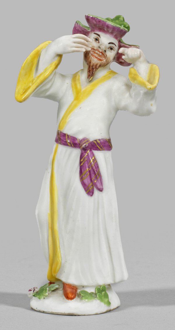 Auf flachem, mit plastischen Blättern und Blüten belegtem Sockel stehender, spitzbärtiger, lächelnder Chinese mit erhobenen Armen, gekleidet in ein bodenlanges, weißes, gelb gefüttertes Gewand, gegürtet von einem purpurfarbenen, goldornamentierten Band. Der Kopf bedeckt von einem grünen Spitzhut. Polychrome Malerei. Entw. Peter Reinicke, um 1743. Minim. rest.; Schwertermarke. 12 cm.