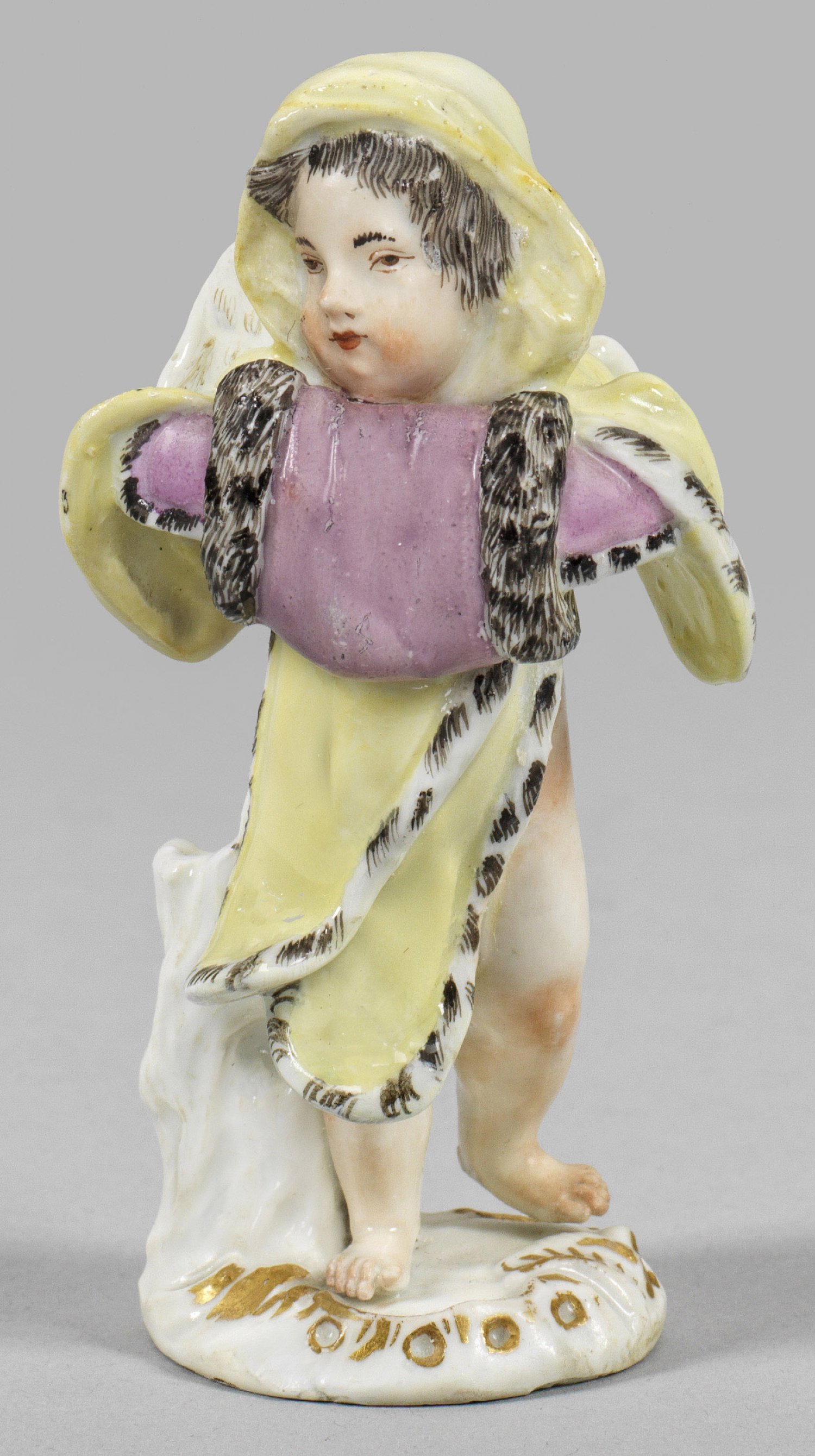 Auf reliefiertem, goldstaffiertem Rocaillesockel stehender, geflügelter Putto als Allegorie des Winters, gehüllt in einen pelzgefütterten, hellgelben Umhang, die Hände in einem purpurfarbenen, pelzverbrämten Muff verbergend. Polychrome Malerei. Entw. Johann Joachim Kaendler. Rest.; Schwertermarke. H. 10 cm.