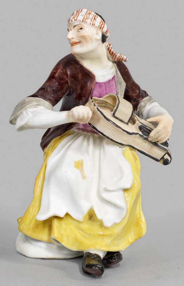 Auf hohem Felssockel sitzende alte Frau in brauner Jacke, purpurfarbenem Mieder, gelbem Rock und zerschlissener weißer Schürze. Auf dem Kopf ein rot gestreiftes Tuch breit über die Stirn gebunden. Mit beiden Händen eine Drehleier spielend. Polychrome Malerei. Entw. Johann Joachim Kaendler. Minim. rest.; H. 11,5 cm.