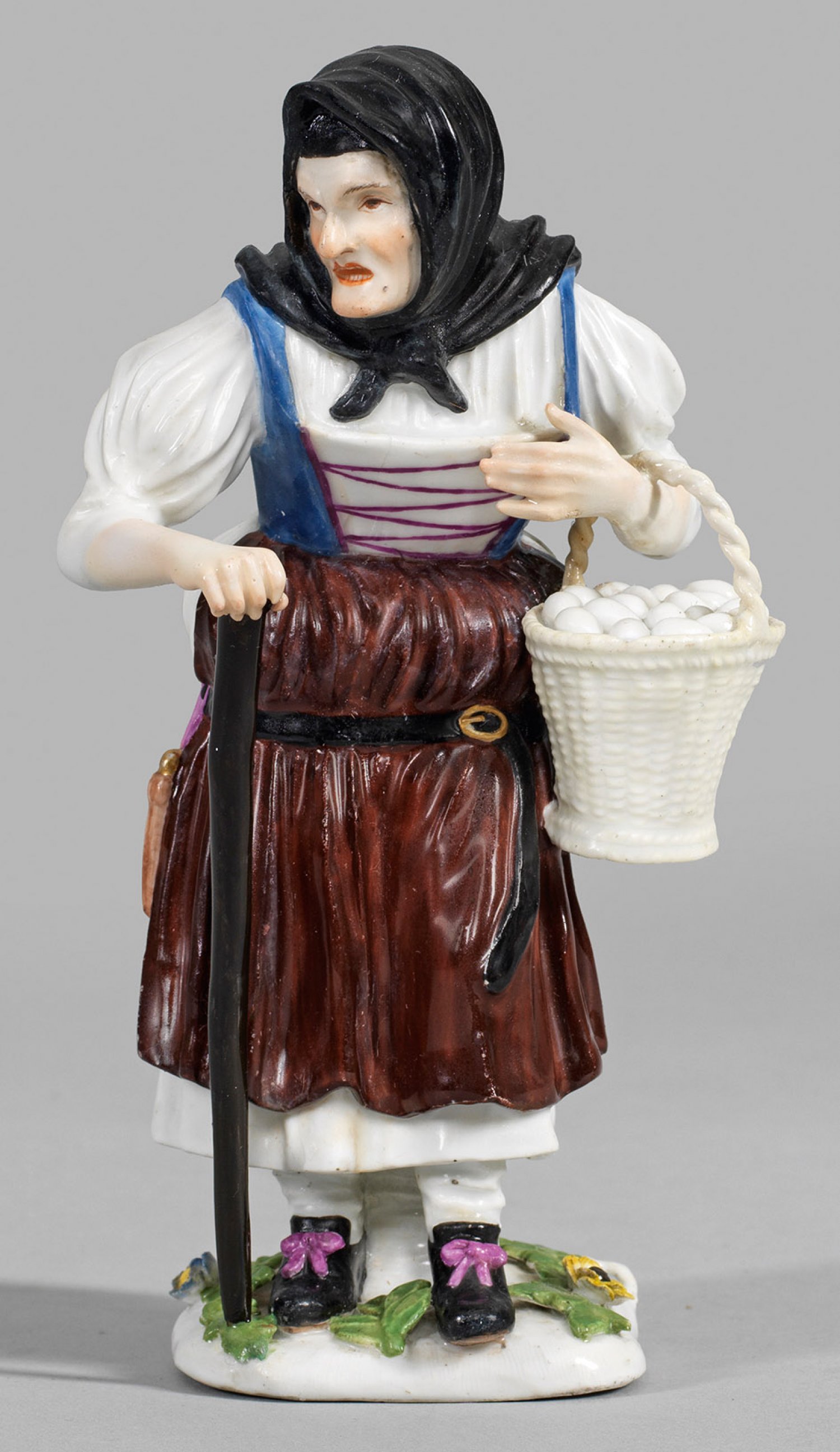 Auf naturalistischem Sockel mit aufgelegten Blüten und Blättern stehende Bäuerin, aus einem Henkelkorb Eier anbietend. Polychrome Malerei. Entw. Johann Joachim Kaendler. Rest.; Schwertermarke. H. 18 cm.