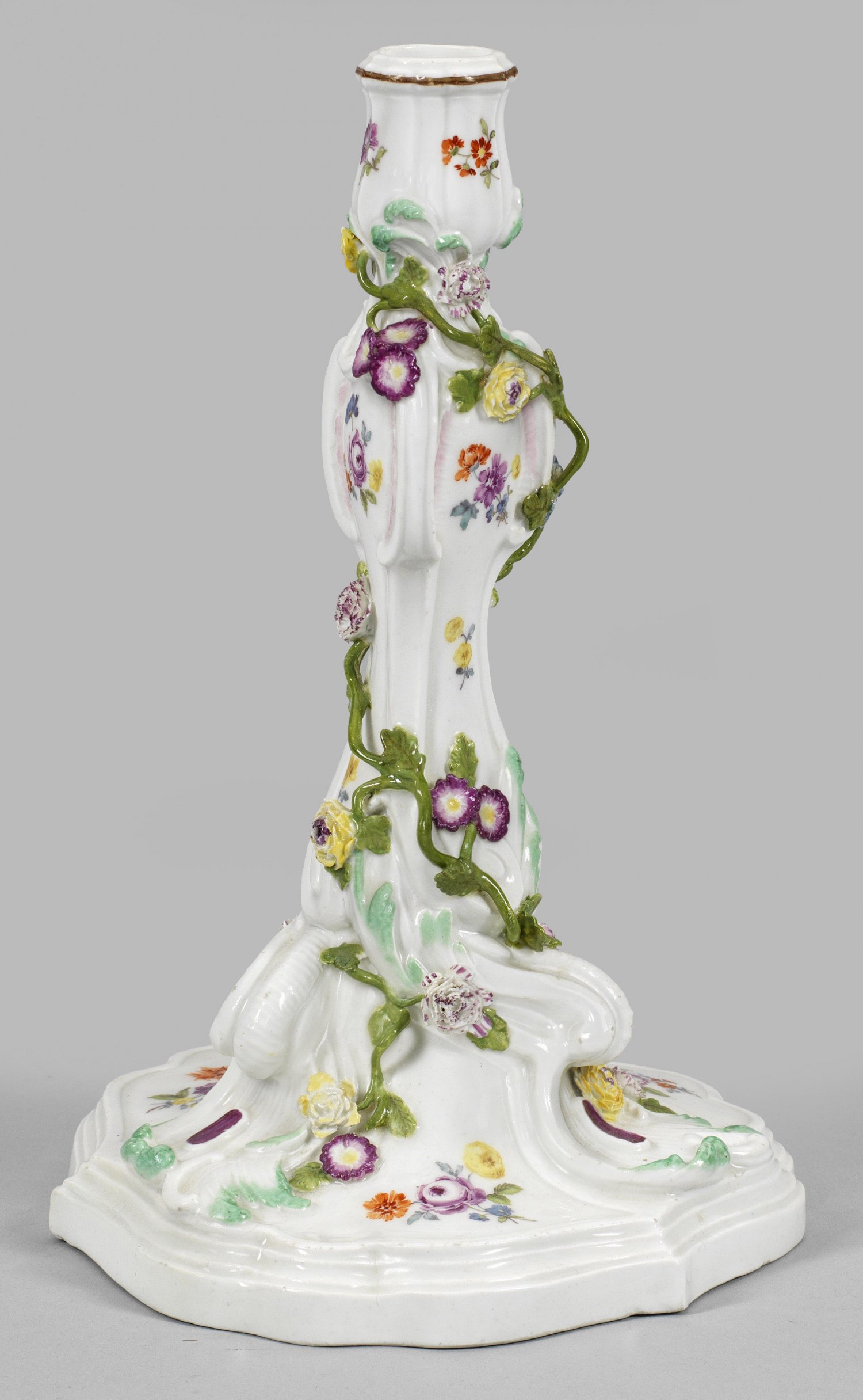 Auf passig geschweiftem, mehrfach getrepptem Stand dreiseitiger, in reliefplastischen Voluten und Rocaillen aufsteigender Balusterschaft mit vasenförmiger, braun konturierter Tülle, allseitig belegt mit feinplastischen Blüten und Ranken sowie staffiert in zartem Rosa und Seegrün. Auf der Wandung in Reliefreserven gerahmte, kleine Blumenbuketts und gestreute Blütenzweige in polychromer Malerei. Schwertermarke. H. 25 cm.