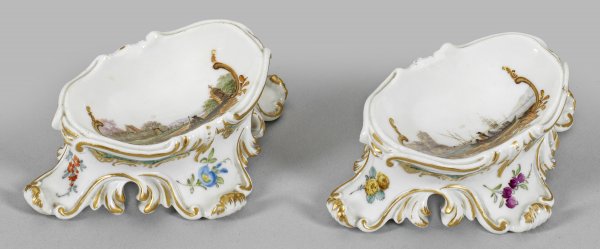 A pair of porcelain salt cellars with Kauffahrtei scene, landscape and decoration after the Russian table set for Catherine II. of Russia. Crossed swords mark.