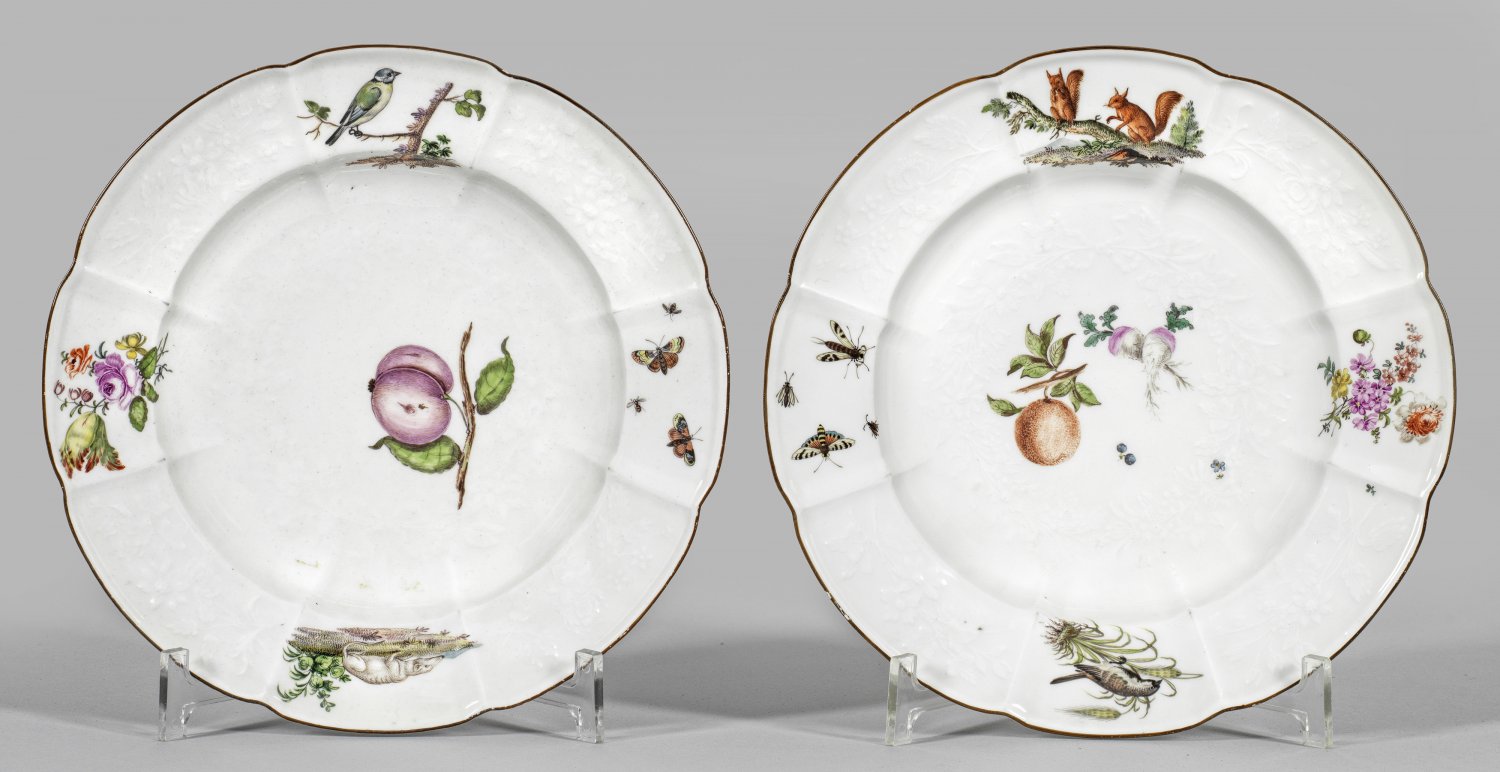 A pair of porcelain plates painted with flowers, fruits and animals. Partly insignificantly chipped. Crossed swords mark.
