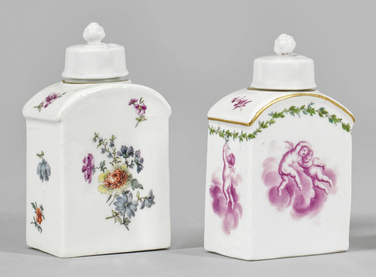 Two porcelain tea caddies with flower and cupid decor. Partly insignificantly restored. Lids added. Crossed swords mark.