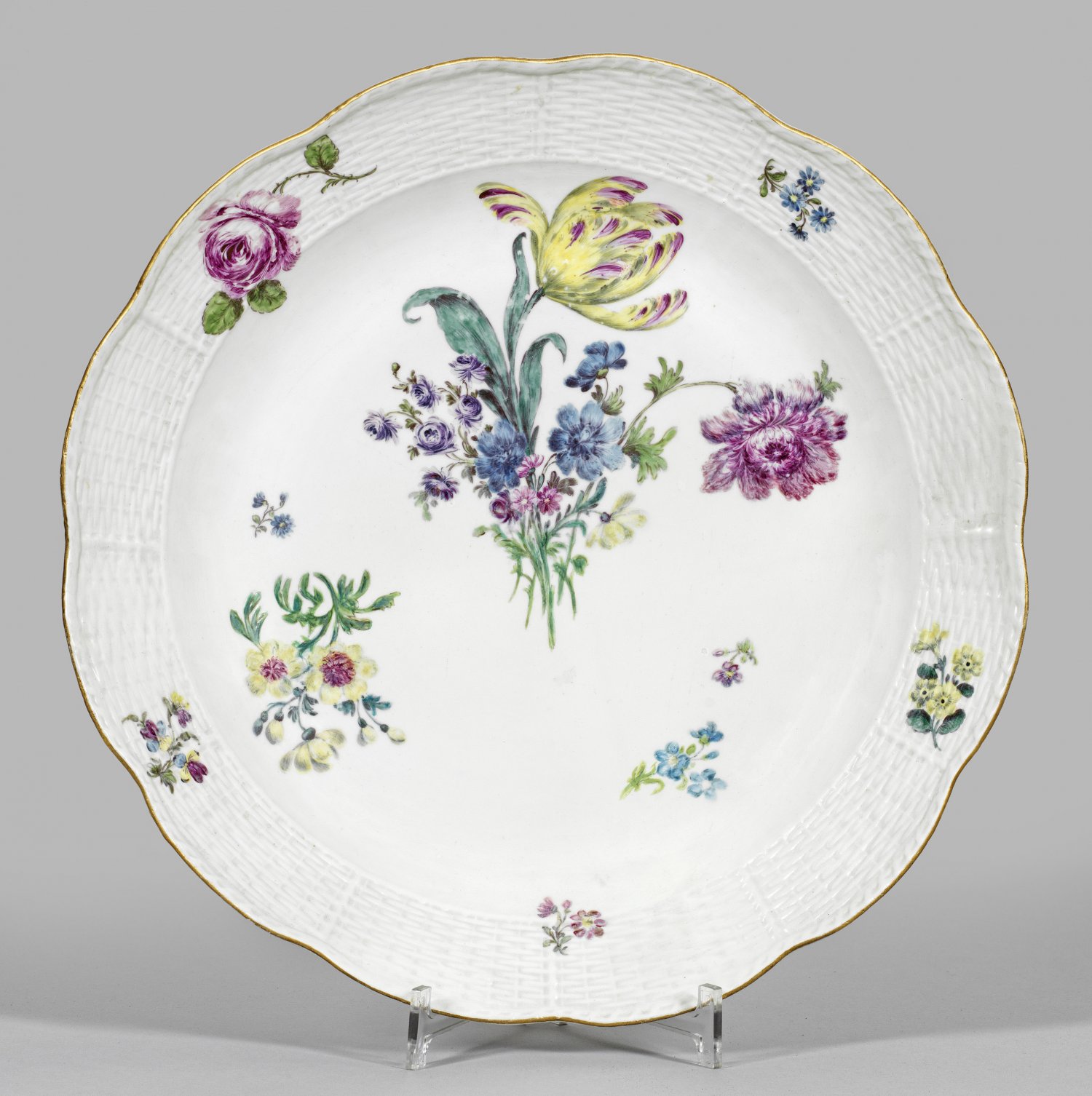 Runde, leicht gemuldete Form mit passig geschweiftem Rand. "Altozier"-Relief. Im Spiegel und auf der Fahne farbenfrohe Gebinde und Blütenzweige aus sog. Manierblumen in polychromer Malerei. Goldrand. Rest.; Schwertermarke. D. 38 cm.