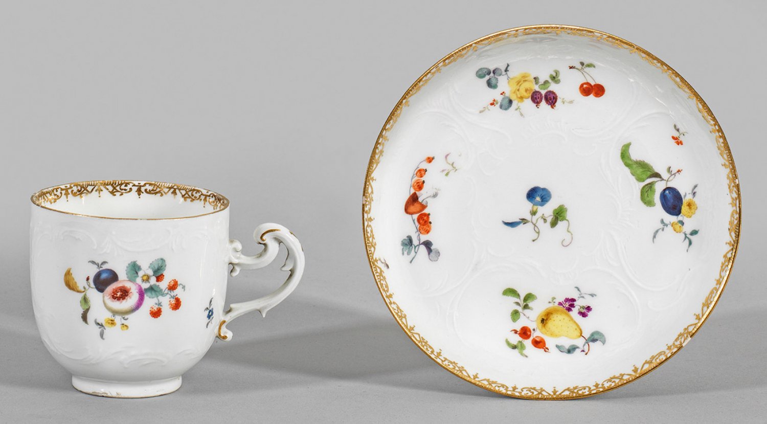 mit Unterschale. Reliefdekor "Dulong". Auf der Wandung und im Spiegel farbenfrohe Obst- und Blütenmotive in feiner polychromer Malerei. Umlaufende Goldspitzenbordüre. Henkel minim. best.; Schwertermarke. H. 7 cm.