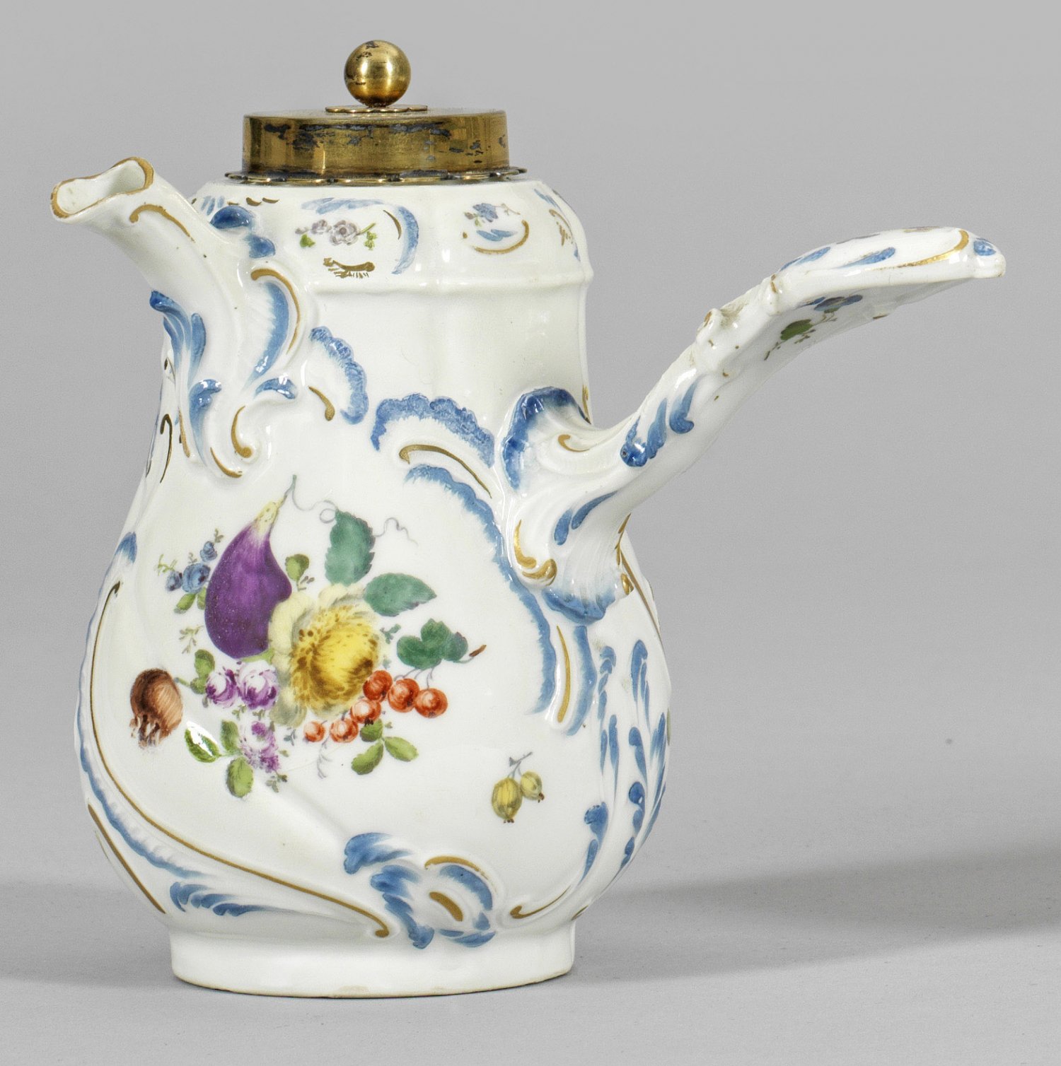 Gebauchter, sich oberhalb verjüngender Korpus mit seitlich geschweiftem Rocaillegriff, in der Front leicht gebogter Röhrenausguss. Umlaufend feine Früchtebuketts und Manierblumen, umzogen von reliefierten, blau staffierten Blattrocaillen. Polychrome Malerei mit Goldstaffage. Erg. Vermeil-Deckel mit Kugelknauf, gest. 925. Rest.; Schwertermarke. H. 14 cm.