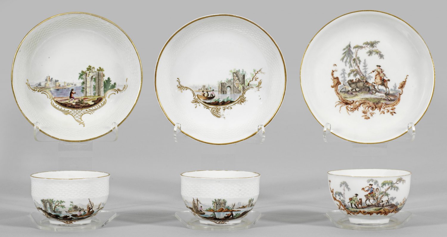 auf Unterschalen. Halbkugelförmig mit Ohren- bzw. Volutenhenkel. Teilw. "Ozier"-Relief. Auf der Schauseite und im Spiegel rocailleförmig umzogene Uferlandschaften mit Architektur bzw. jagdliche Szenen mit Reiter und Hatzhunden in polychromer Malerei. Teilw. minim. rest.; Schwerter- und Manufakturmarke. H. 4,5 cm.